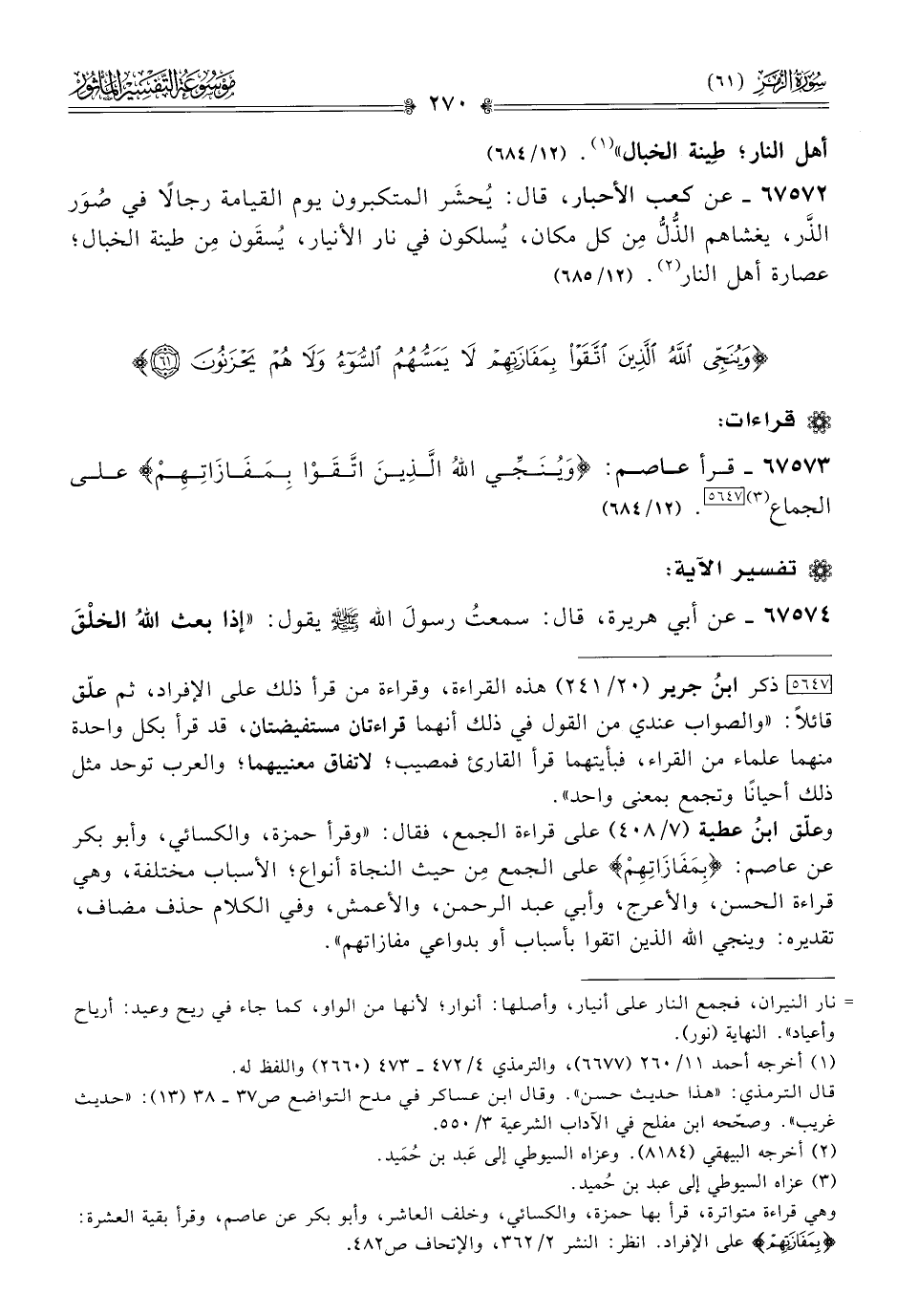 وعلّق ابنُ عطية (٧/ ٤٠٨) على قراءة الجمع، فقال: «وقرأ حمزة، والكسائي، وأبو بكر عن عاصم: «بِمَفازاتِهِمْ» على الجمع مِن حيث النجاة أنواع؛ الأسباب مختلفة، وهي قراءة الحسن، والأعرج، وأبي عبد الرحمن، والأعمش، وفي الكلام حذف مضاف، تقديره: وينجي الله الذين اتقوا بأسباب أو بدواعي مفازاتهم».