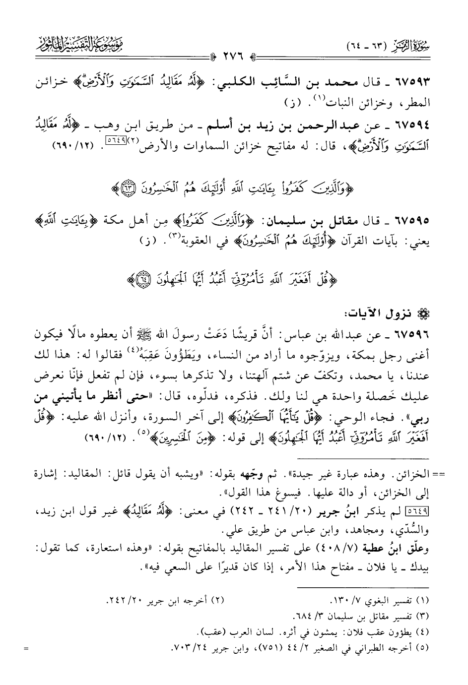 ٦٧٥٩٤ - عن عبد الرحمن بن زيد بن أسلم -من طريق ابن وهب- {لَهُ مَقالِيدُ السَّماواتِ والأَرْضِ}، قال: له مفاتيح خزائن السماوات والأرض (¬٢) [٥٦٤٩]. (١٢/ ٦٩٠)