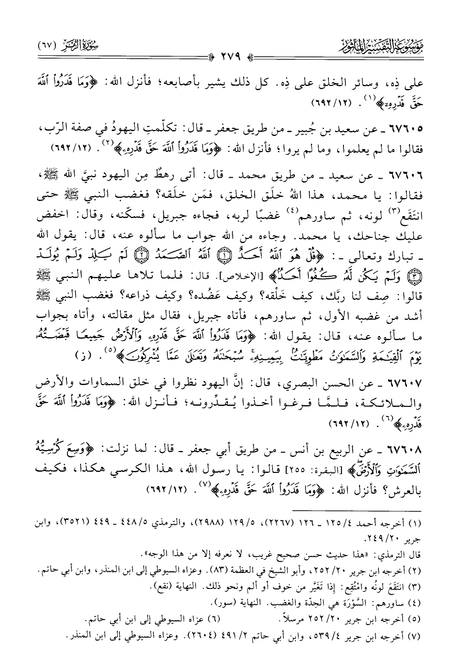 ٦٧٦٠٥ - عن سعيد بن جُبير -من طريق جعفر- قال: تكلّمتِ اليهودُ في صفة الرّب، فقالوا ما لم يعلموا، وما لم يروا؛ فأنزل الله: {وما قَدَرُوا اللَّهَ حَقَّ قَدْرِهِ} (¬٢). (١٢/ ٦٩٢)