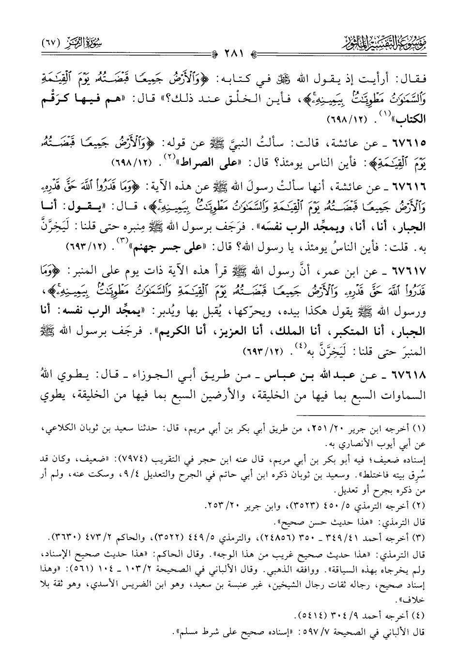 ٦٧٦١٦ - عن عائشة، أنها سألتْ رسولَ الله - صلى الله عليه وسلم - عن هذه الآية: {وما قَدَرُوا اللَّهَ حَقَّ قَدْرِهِ والأَرْضُ جَمِيعًا قَبْضَتُهُ يَوْمَ القِيامَةِ والسَّماواتُ مَطْوِيّاتٌ بِيَمِينِهِ}، قال: «يقول: أنا الجبار، أنا، أنا، ويمجِّد الرب نفسَه». فرَجَف برسول الله - صلى الله عليه وسلم - مِنبره حتى قلنا: لَيَخِرَّنَّ به. قلت: فأين الناسُ يومئذ، يا رسول الله؟ قال: «على جسر جهنم» (¬٣). (١٢/ ٦٩٣)