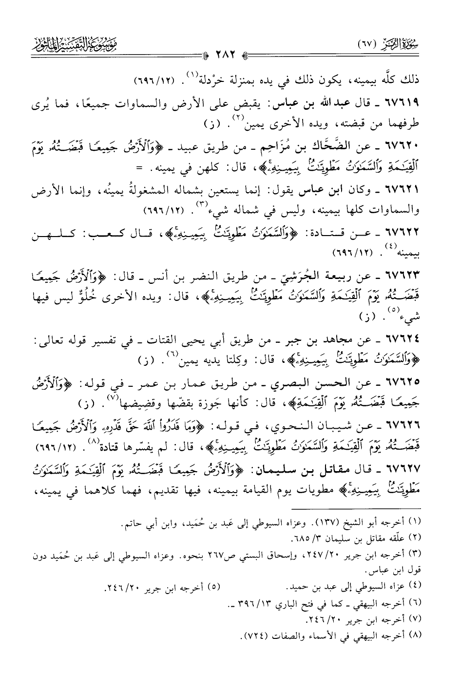 ٦٧٦١٩ - قال عبد الله بن عباس: يقبض على الأرض والسماوات جميعًا، فما يُرى طرفهما من قبضته، ويده الأخرى يمين (¬٢). (ز)