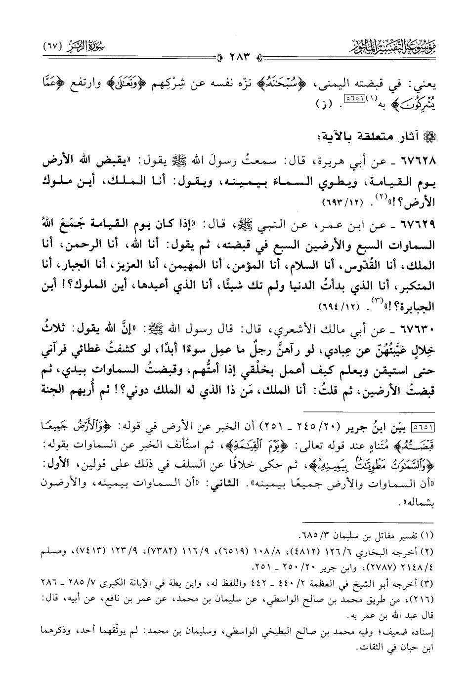 [٥٦٥١] بيّن ابنُ جرير (٢٠/ ٢٤٥ - ٢٥١) أن الخبر عن الأرض في قوله: {والأرض جميعا قبضته} مُتَناهٍ عند قوله تعالى: {يوم القيامة}، ثم استُأنف الخبر عن السماوات بقوله: {والسماوات مطويات بيمينه}، ثم حكى خلافًا عن السلف في ذلك على قولين، الأول: «أن السماوات والأرض جميعًا بيمينه». الثاني: «أن السماوات بيمينه، والأرضون بشماله».