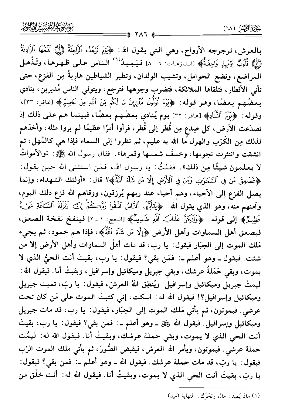 بالعرش، ترجرجه الأرواح، وهي التي يقول الله: {يَوْمَ تَرْجُفُ الرّاجِفَةُ تَتْبَعُها الرّادِفَةُ قُلُوبٌ يَوْمَئِذٍ واجِفَةٌ} [النازعات: ٨] فيَمِيدُ (¬١) الناس على ظهرها، وتَذْهل المراضع، وتضع الحوامل، وتشيب الولدان، وتطير الشياطين هارِبةً مِن الفزع، حتى تأتي الأقطار، فتلقاها الملائكة، فتضرب وجوهها فترجع، ويتولي الناس مُدبرين، ينادي بعضُهم بعضًا، وهو قوله: {يَوْمَ تُوَلُّونَ مُدْبِرِينَ ما لَكُمْ مِنَ اللَّهِ مِن عاصِمٍ} [غافر: ٣٣]، [وقوله: {يَوْمَ التَّنادِ} [غافر: ٣٢] يوم يُنادي بعضُهم بعضًا، فبينما هم على ذلك إذ تصدّعت الأرض، كل صِدعٍ مِن قُطر إلى قُطر، فرأوا أمرًا عظيمًا لم يروا مثله، وأخذهم لذلك مِن الكَرْب والهول ما الله به عليم، ثم نظروا إلى السماء فإذا هي كالمُهل، ثم انشقت وانتثرت نجومها، وخسفَ شمسها وقمرها». فقال رسول الله - صلى الله عليه وسلم -: «والأمواتُ لا يعلمون شيئًا مِن ذلك». فقلتُ: يا رسول الله، فمَن استثنى الله حين يقول: {فَصَعِقَ مَن فِي السَّماواتِ ومَن فِي الأَرْضِ إلّا مَن شاءَ اللَّهُ}؟ قال: «أولئك الشهداء، وإنما يصل الفزع إلى الأحياء، وهم أحياء عند ربهم يُرزقون، ووقاهم الله فزع ذلك اليوم، وآمنهم منه، وهو الذي يقول الله: {يا أيُّها النّاسُ اتَّقُوا رَبَّكُمْ إنَّ زَلْزَلَةَ السّاعَةِ شَيْءٌ عَظِيمٌ} إلى قوله: {ولَكِنَّ عَذابَ اللَّهِ شَدِيدٌ} [الحج: ١ - ٢] فينفخ نفخة الصعق، فيصعق أهل السماوات وأهل الأرض {إلّا مَن شاءَ اللَّهُ}، فإذا هم خمود، ثم يجيء مَلك الموت إلى الجبّار فيقول: يا رب، قد مات أهلُ السماوات وأهل الأرض إلا من شئت. فيقول -وهو أعلم-: فمَن بقي؟ فيقول: يا رب، بقيتَ أنت الحيُّ الذي لا يموت، وبقي حَمَلةُ عرشك، وبقي جبريل وميكائيل وإسرافيل، وبقيتُ أنا. فيقول الله: ليمتْ جبريل وميكائيل وإسرافيل. ويُنطِق اللهُ العرشَ، فيقول: يا ربّ، تميت جبريل وميكائيل وإسرافيل؟! فيقول الله له: اسكت، إني كتبتُ الموت على مَن كان تحت عرشي. فيموتون، ثم يأتي مَلك الموت إلى الجبّار، فيقول: يا رب، قد مات جبريل وميكائيل وإسرافيل. فيقول الله - عز وجل -وهو أعلم-: فمن بقي؟ فيقول: يا رب، بقيتَ أنت الحي الذي لا يموت، وبقي حملة عرشك، وبقيتُ أنا. فيقول الله له: ليمُت حملة عرشي. فيموتون، ويأمر الله العرش، فيقبض الصُّورَ، ثم يأتي ملك الموت الرّب فيقول: يا ربّ، قد مات حملة عرشك. فيقول الله -وهو أعلم-: فمن بقي؟ فيقول: يا ربّ، بقيتَ أنت الحي الذي لا يموت، وبقيتُ أنا. فيقول الله له: أنت خلْق من