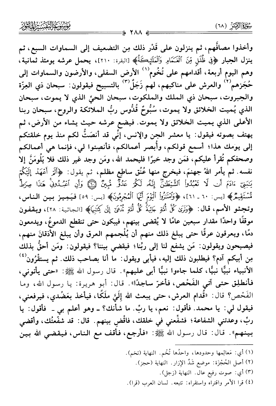 وأخذوا مصافَّهم، ثم ينزلون على قَدْر ذلك مِن التضعيف إلى السماوات السبع، ثم ينزل الجبار {فِي ظُلَلٍ مِنَ الغَمامِ والمَلائِكَةُ} [البقرة: ٢١٠]، يحمل عرشه يومئذ ثمانية، وهم اليوم أربعة، أقدامهم على تُخُوم (¬١) الأرض السفلى، والأرضون والسماوات إلى حُجَزهم (¬٢)، والعرش على مناكبهم، لهم زَجَلٌ (¬٣) بالتسبيح فيقولون: سبحان ذي العِزّة والجبروت، سبحان ذي الملك والملكوت، سبحان الحيِّ الذي لا يموت، سبحان الذي يُميت الخلائق ولا يموت، سُبُّوحٌ قُدُّوس ربُّ الملائكة والروح، سبحان ربنا الأعلى الذي يميت الخلائق ولا يموت. فيضع عرشه حيث يشاء من الأرض، ثم يهتف بصوته فيقول: يا معشر الجن والإنس، إنِّي قد أنصَتُّ لكم منذ يوم خلقتكم إلى يومك هذا؛ أسمع قولكم، وأُبصر أعمالكم، فأنصِتوا لي، فإنما هي أعمالكم وصحفكم تُقرأ عليكم، فمَن وجد خيرًا فليحمد الله، ومَن وجد غير ذلك فلا يَلُومَنَّ إلا نفسه. ثم يأمر اللهُ جهنمَ، فيخرج منها عُنُق ساطِع مظلم، ثم يقول: {ألَمْ أعْهَدْ إلَيْكُمْ يا بَنِي آدَمَ أنْ لا تَعْبُدُوا الشَّيْطانَ إنَّهُ لَكُمْ عَدُوٌّ مُبِينٌ وأَنِ اعْبُدُونِي هَذا صِراطٌ مُسْتَقِيمٌ} [يس: ٦٠ - ٦١]، {وامْتازُوا اليَوْمَ أيُّها المُجْرِمُونَ} [يس: ٥٩] فيَمِيز بين الناس، وتجثو الأمم، قال: {وتَرى كُلَّ أُمَّةٍ جاثِيَةً كُلُّ أُمَّةٍ تُدْعى إلى كِتابِها} [الجاثية: ٢٨]، ويقفون موقفًا واحدًا مقدار سبعين عامًا لا يُقضى بينهم، فيبكون حتى تنقطع الدموعُ، ويدمعون دمًا، ويعرقون عرقًا حتى يبلغ ذلك منهم أن يُلْجمهم العرق وأن يبلغ الأذقانَ منهم، فيصيحون ويقولون: مَن يشفع لنا إلى ربِّنا؛ فيقضي بيننا؟ فيقولون: ومَن أحقُّ بذلك مِن أبيكم آدم؟ فيطلبون ذلك إليه، فيأبى ويقول: ما أنا بصاحب ذلك. ثم يستقْرُون (¬٤) الأنبياء نبيًّا نبيًّا، كلما جاءوا نبيًّا أبى عليهم». قال رسول الله - صلى الله عليه وسلم -: «حتى يأتوني، فأنطلِق حتى آتي الفَحْص، فأخرّ ساجدًا». قال: أبو هريرة: يا رسول الله، وما الفَحْص؟ قال: «قُدام العرش، حتى يبعث الله إلَيَّ ملَكًا، فيأخذ بعَضُدي، فيرفعني، فيقول لي: يا محمد. فأقول: نعم، يا ربِّ. ما شأنك؟ -وهو أعلم بي- فأقول: يا ربِّ، وعدتني الشفاعة؛ فشفِّعني في خلقك، فاقْضِ بينهم. قال: قد شفّعتُك، وأقضي بينهم». قال: قال رسول الله - صلى الله عليه وسلم -: «فأرجع، فأقف مع الناس، فيقضي الله بين