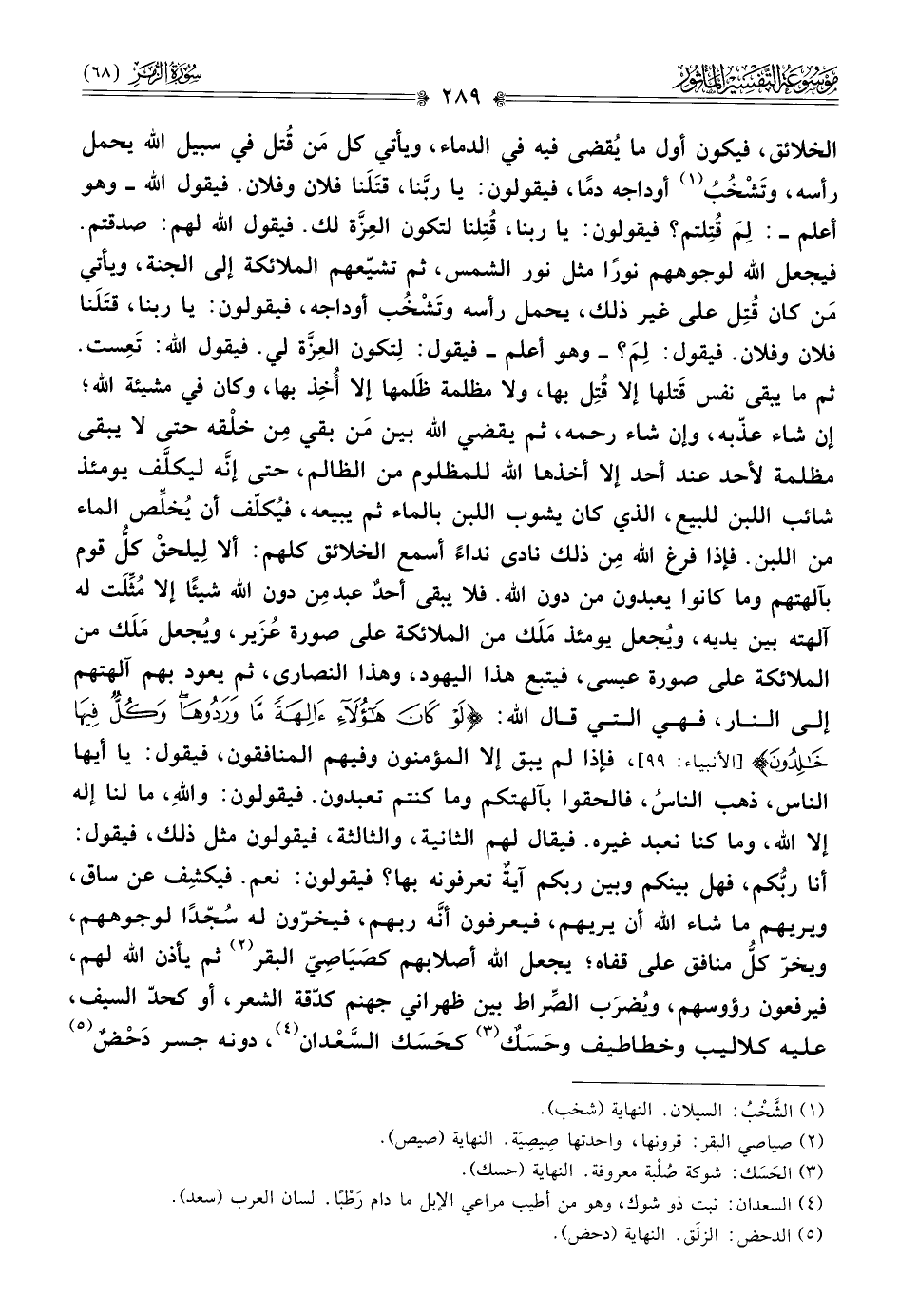 فإذا فرغ الله مِن ذلك نادى نداءً أسمع الخلائق كلهم: ألا لِيلحقْ كلُّ قوم بآلهتهم وما كانوا يعبدون من دون الله. فلا يبقى أحدٌ عبد مِن دون الله شيئًا إلا مُثِّلَت له آلهته بين يديه، ويُجعل يومئذ مَلَك من الملائكة على صورة عُزَير، ويُجعل مَلَك من الملائكة على صورة عيسى، فيتبع هذا اليهود، وهذا النصارى، ثم يعود بهم آلهتهم إلى النار، فهي التي قال الله: {لَوْ كَانَ هَؤُلَاءِ آلِهَةً مَا وَرَدُوهَا وَكُلٌّ فِيهَا خَالِدُونَ} [الأنبياء: ٩٩]، فإذا لم يبق إلا المؤمنون وفيهم المنافقون، فيقول: يا أيها الناس، ذهب الناسُ، فالحقوا بآلهتكم وما كنتم تعبدون. فيقولون: واللهِ، ما لنا إله إلا الله، وما كنا نعبد غيره. فيقال لهم الثانية، والثالثة، فيقولون مثل ذلك، فيقول: أنا ربُّكم، فهل بينكم وبين ربكم آيةٌ تعرفونه بها؟ فيقولون: نعم. فيكشِف عن ساق، ويريهم ما شاء الله أن يريهم، فيعرفون أنَّه ربهم، فيخرّون له سُجّدًا لوجوههم، ويخرّ كلُّ منافق على قفاه؛ يجعل الله أصلابهم كصَيَاصِيّ البقر (¬٢)، ثم يأذن الله لهم، فيرفعون رؤوسهم، ويُضرَب الصِّراط بين ظهراني جهنم كدّقة الشعر، أو كحدّ السيف، عليه كلاليب وخطاطيف وحَسَكٌ (¬٣) كحَسَك السَّعْدان (¬٤)، دونه جسر دَحْضٌ (¬٥)