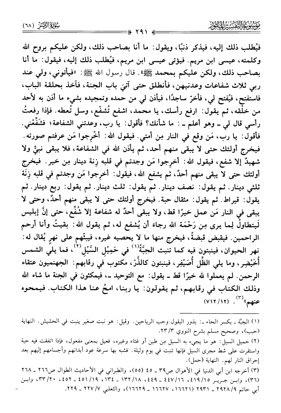 فيُطلب ذلك إليه، فيذكر ذنبًا، ويقول: ما أنا بصاحب ذلك، ولكن عليكم بروح الله وكلمته، عيسى ابن مريم. فيؤتى عيسى ابن مريم، فيُطلب ذلك إليه، فيقول: ما أنا بصاحب ذلك، ولكن عليكم بمحمد - صلى الله عليه وسلم -». قال رسول الله - صلى الله عليه وسلم -: «فيأتوني، ولي عند ربي ثلاث شفاعات وعدنيهن، فأنطلق حتى آتيَ باب الجنة، فآخذ بحلقة الباب، فاستفتح، فيُفتح لي، فأخرّ ساجدًا، فيأذن لي من حمده وتمجيده بشيء ما أذن به لأحد من خلْقه، ثم يقول: ارفع رأسك، يا محمد، اشفع تُشفّع، وسل تُعطه. فإذا رفعتُ رأسي قال لي -وهو أعلم-: ما شأنك؟ فأقول: يا رب، وعدتني الشفاعة؛ فشَفِّعْني. فأقول: يا رب، مَن وقع في النار مِن أمتي. فيقول الله: أخْرِجوا مَن عرفتم صورته. فيخرج أولئك حتى لا يبقى منهم أحد، ثم يأذن الله في الشفاعة، فلا يبقى نبيٌّ ولا شهيدٌ إلا شفع، فيقول الله: أخرِجوا مَن وجدتم في قلبه زِنة دينار مِن خير. فيخرج أولئك حتى لا يبقى منهم أحدٌ، ثم يشفع الله، فيقول: أخرِجوا مَن وجدتم في قلبه زِنَة ثلثي دينار. ثم يقول: نصف دينار. ثم يقول: ثلث دينار. ثم يقول: ربع دينار. ثم يقول: قيراط. ثم يقول: مثقال حبة. فيخرج أولئك حتى لا يبقى منهم أحدٌ، وحتى لا يبقى في النار مَن عمل خيرًا قط، ولا يبقى أحدٌ له شفاعة إلا شُفِّع، حتى إنّ إبليس لَيتطاولُ لِما يرى مِن رَحْمَة اللَّه رجاءَ أن يُشفع له، ثم يقول الله: بقيتُ وأنا أرحم الراحمين. فيقبض قبضةً، فيخرج منها ما لا يحصيه غيره، فيبثّهم على نهرٍ يُقال له: نهر الحيوان، فينبتون فيه كما تنبت الحِبَّةُ (¬١) في حَمِيلِ السَّيْلِ (¬٢)، فما يلي الشمس أُخَيْضِر، وما يلي الظِّل أُصَيْفِر، فينبتون كالذَّرّ، مكتوب في رقابهم: الجهنميون عتقاء الرحمن. لم يعملوا لله خيرًا قط -يقول: مع التوحيد-، فيمكثون في الجنة ما شاء الله وذلك الكتاب في رقابهم، ثم يقولون: يا ربنا، امحُ عنا هذا الكتاب. فيمحوه عنهم» (¬٣). (١٢/ ٧١٢)
