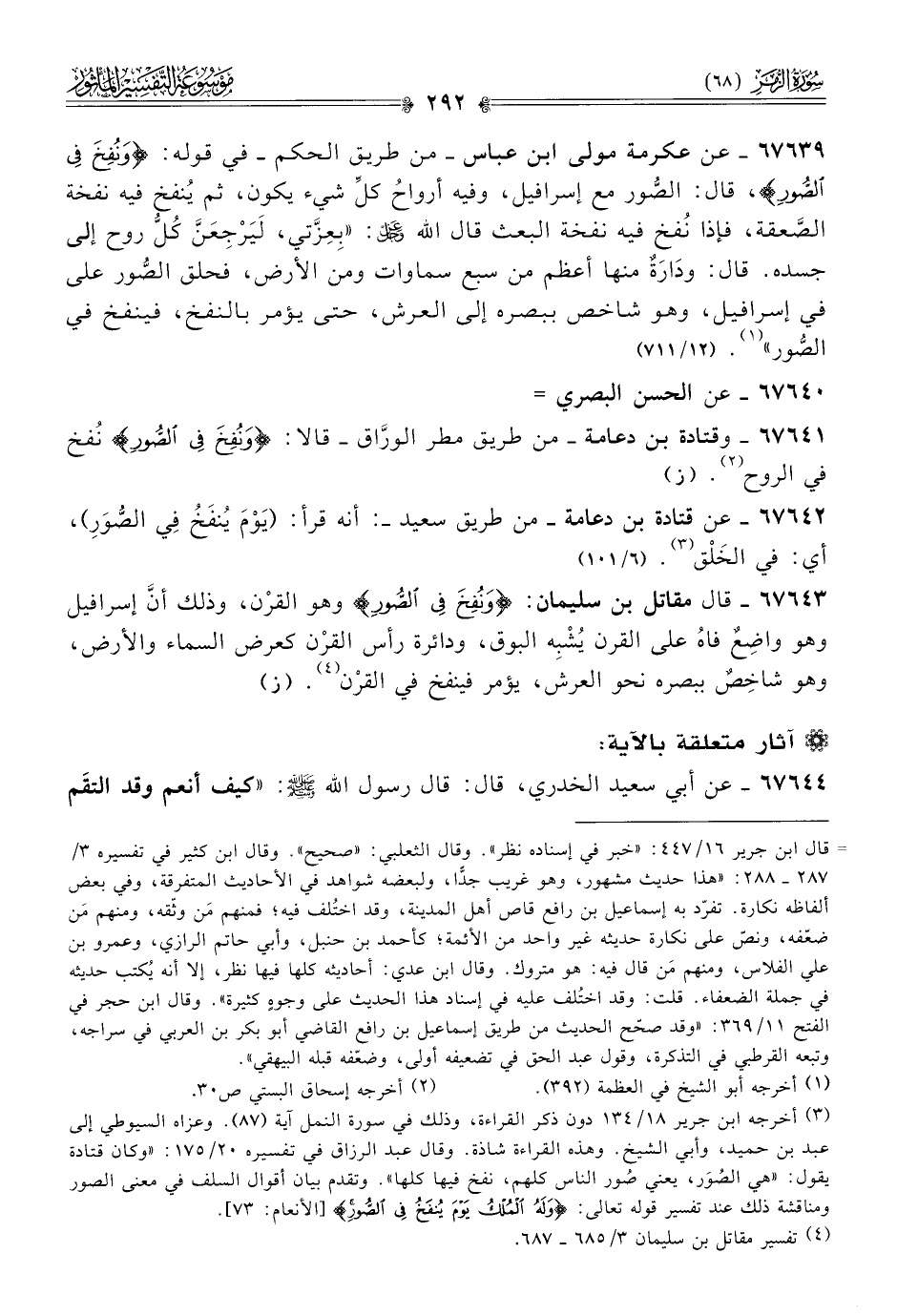 ٦٧٦٤٢ - عن قتادة بن دعامة -من طريق سعيد- أنه قرأ: (يَوْمَ يُنفَخُ فِي الصُّوَرِ)، أي: في الخَلْق (¬٣). (٦/ ١٠١)