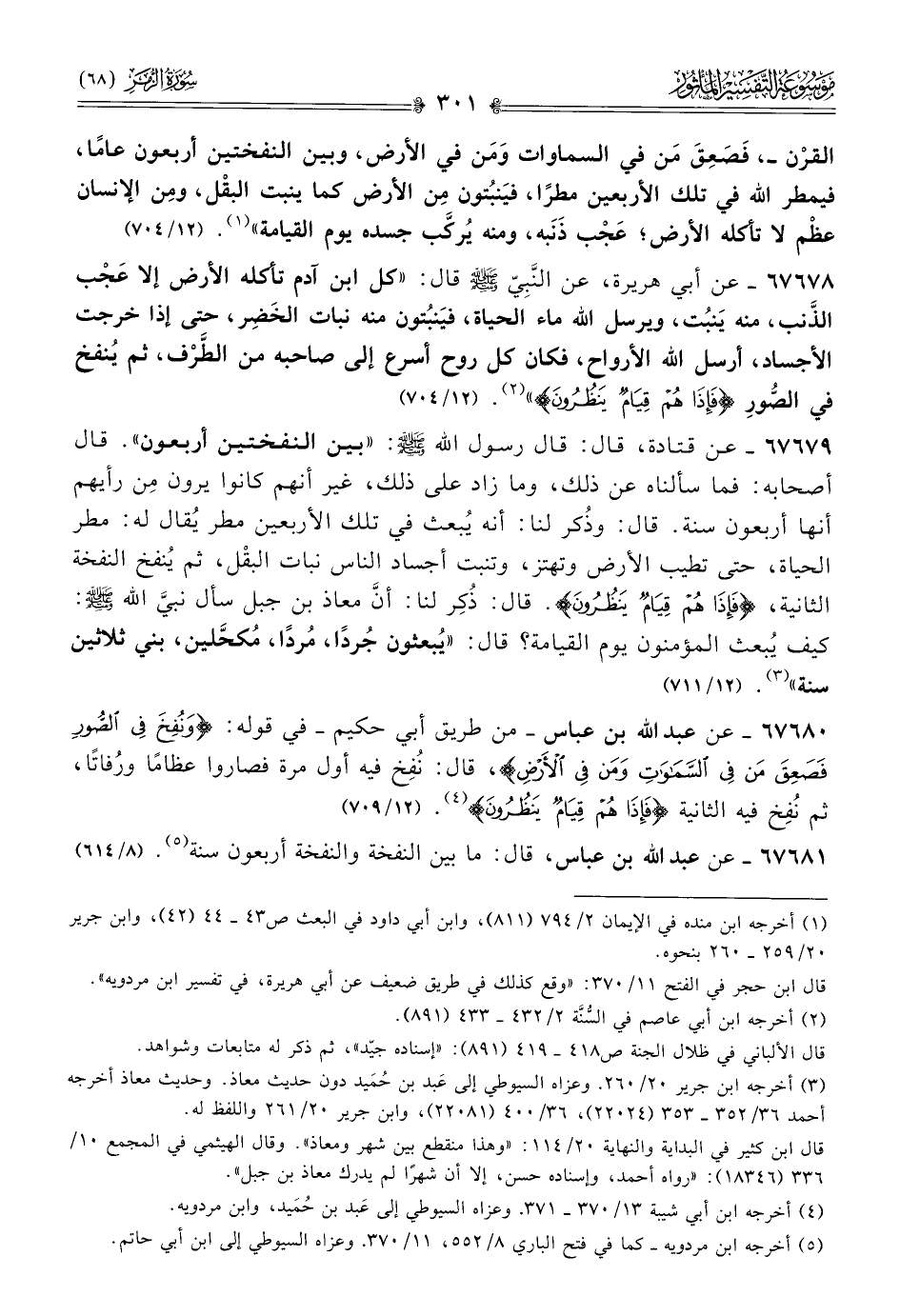 ٦٧٦٨٠ - عن عبد الله بن عباس -من طريق أبي حكيم- في قوله: {ونُفِخَ فِي الصُّورِ فَصَعِقَ مَن فِي السَّماواتِ ومَن فِي الأَرْضِ}، قال: نُفِخ فيه أول مرة فصاروا عظامًا ورُفاتًا، ثم نُفِخ فيه الثانية {فَإذا هُمْ قِيامٌ يَنْظُرُونَ} (¬٤). (١٢/ ٧٠٩)