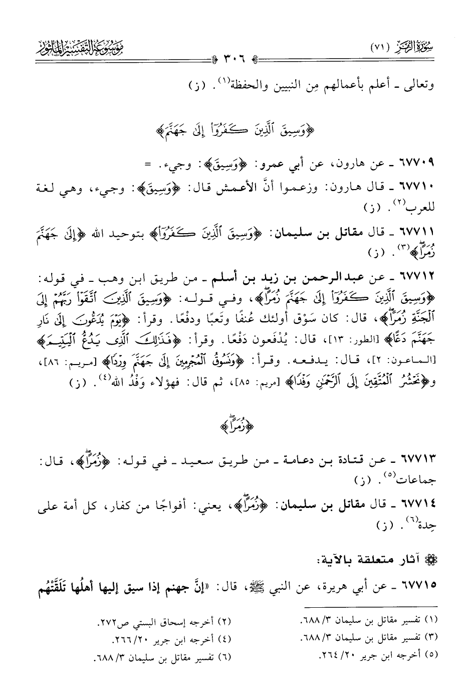 ٦٧٧١٤ - قال مقاتل بن سليمان: {زُمَرًا}، يعني: أفواجًا من كفار، كل أمة على حِدة (¬٦). (ز)