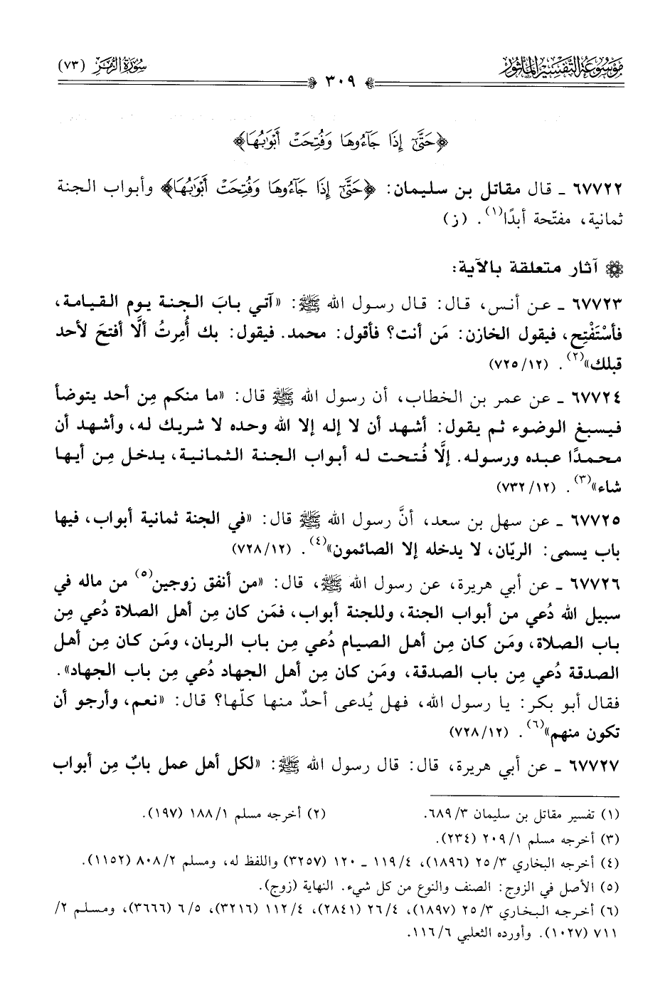 ٦٧٧٢٢ - قال مقاتل بن سليمان: {حَتّى إذا جاءُوها وفُتِحَتْ أبْوابُها} وأبواب الجنة ثمانية، مفتّحة أبدًا (¬١). (ز)