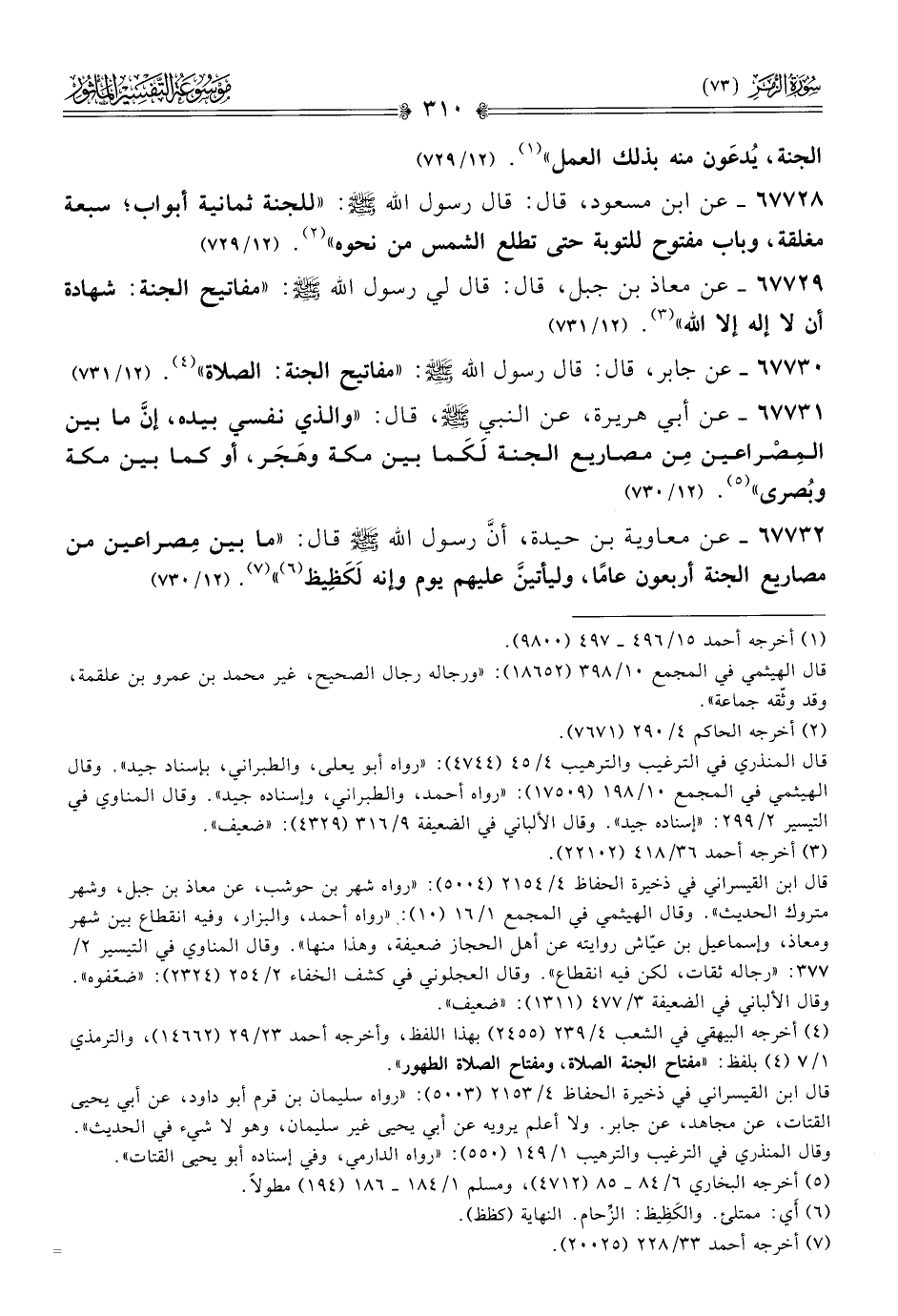 ٦٧٧٣٢ - عن معاوية بن حيدة، أنّ رسول الله - صلى الله عليه وسلم - قال: «ما بين مِصراعين من مصاريع الجنة أربعون عامًا، وليأتينَّ عليهم يوم وإنه لَكَظِيظ (¬٦)» (¬٧). (١٢/ ٧٣٠)