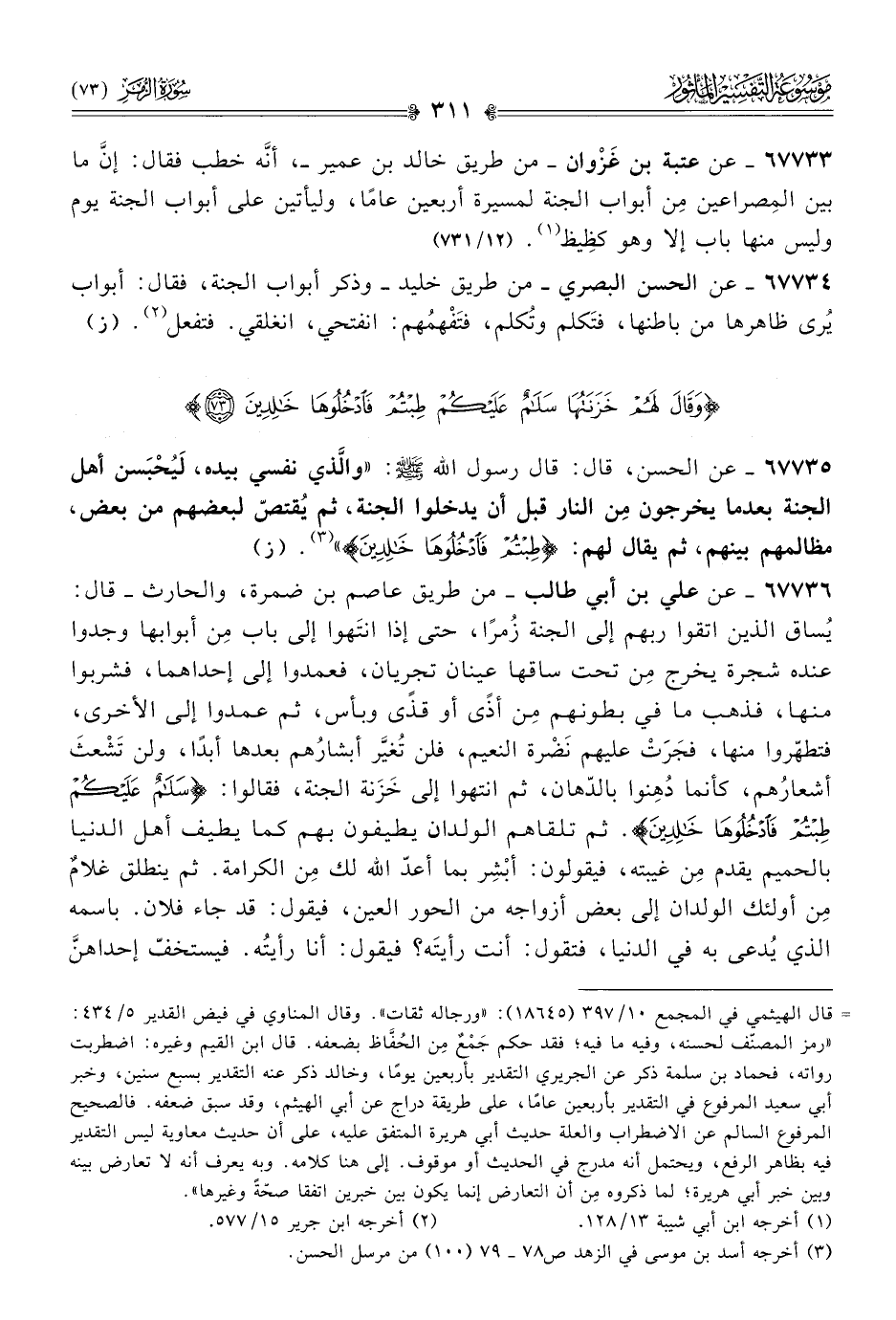 ٦٧٧٣٥ - عن الحسن، قال: قال رسول الله - صلى الله عليه وسلم -: «والَّذي نفسي بيده، لَيُحْبَسن أهل الجنة بعدما يخرجون مِن النار قبل أن يدخلوا الجنة، ثم يُقتصّ لبعضهم من بعض، مظالمهم بينهم، ثم يقال لهم: {طبتم فادخلوها خالدين}» (¬٣). (ز)