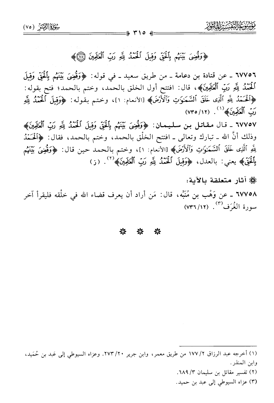 ٦٧٧٥٦ - عن قتادة بن دعامة -من طريق سعيد- في قوله: {وقُضِي َبَيْنَهُمْ بِالحَق ِّوَقِيل الحَمْد ُلِلَّه ِرَب ِّالعالَمِينَ}، قال: افتتح أول الخلق بالحمد، وختم بالحمد؛ فتح بقوله: {الحَمْدُ لِلَّهِ الَّذِي خَلَقَ السَّماواتِ والأَرْضَ} [الأنعام: ١]، وختم بقوله: {وقِيلَ الحَمْد ُلِلَّه ِرَب ِّالعالَمِينَ} (¬١). (١٢/ ٧٣٥)