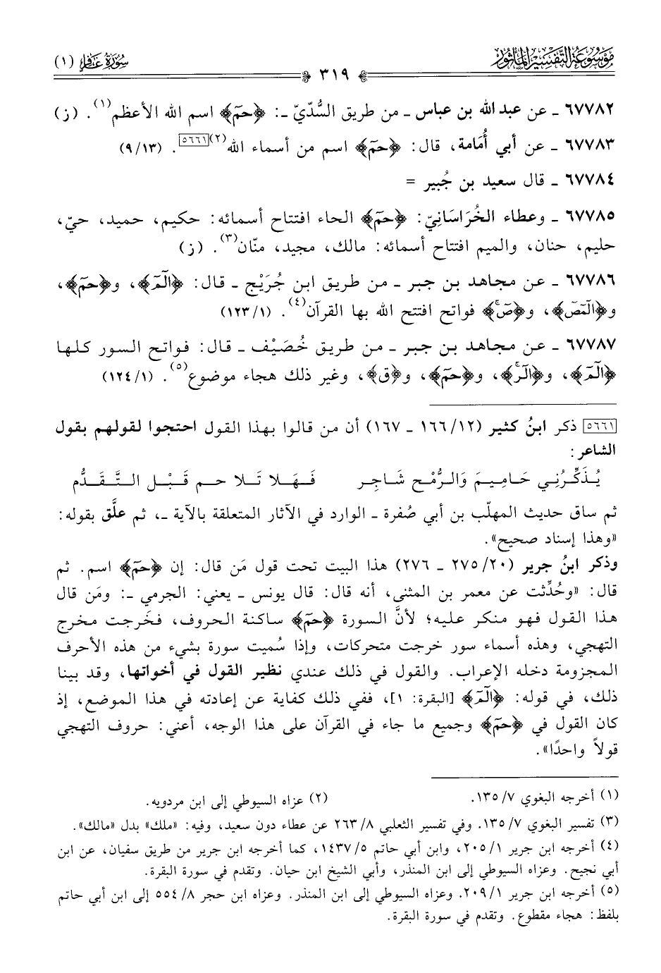 ثم ساق حديث المهلّب بن أبي صُفرة -الوارد في الآثار المتعلقة بالآية-، ثم علَّق بقوله: «وهذا إسناد صحيح».وذكر ابن جرير (٢٠/ ٢٧٥ - ٢٧٦) هذا البيت تحت قول مَن قال: إن {حم} اسم. ثم قال: «وحُدِّثت عن معمر بن المثنى، أنه قال: قال يونس -يعني: الجرمي-: ومَن قال هذا القول فهو منكر عليه؛ لأنّ السورة {حم} ساكنة الحروف، فخَرجت مخرج التهجي، وهذه أسماء سور خرجت متحركات، وإذا سُميت سورة بشيء من هذه الأحرف المجزومة دخله الإعراب. والقول في ذلك عندي نظير القول في أخواتها، وقد بينا ذلك، في قوله: {الم} [البقرة: ١]، ففي ذلك كفاية عن إعادته في هذا الموضع، إذ كان القول في {حم} وجميع ما جاء في القرآن على هذا الوجه، أعني: حروف التهجي قولًا واحدًا».