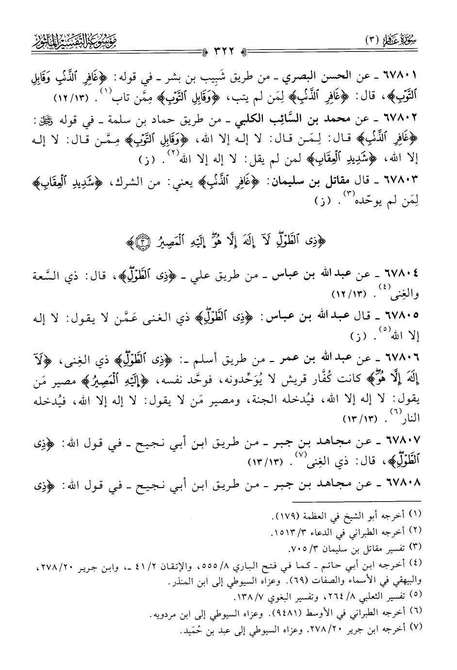 ٦٧٨٠٦ - عن عبد الله بن عمر -من طريق أسلم-: {ذِي الطَّوْلِ} ذي الغِنى، {لا إلَهَ إلّا هُوَ} كانت كُفّار قريش لا يُوَحِّدونه، فوحَّد نفسه، {إلَيْهِ المَصِيرُ} مصير مَن يقول: لا إله إلا الله، فيُدخله الجنة، ومصير مَن لا يقول: لا إله إلا الله، فيُدخله النار (¬٦). (١٣/ ١٣)