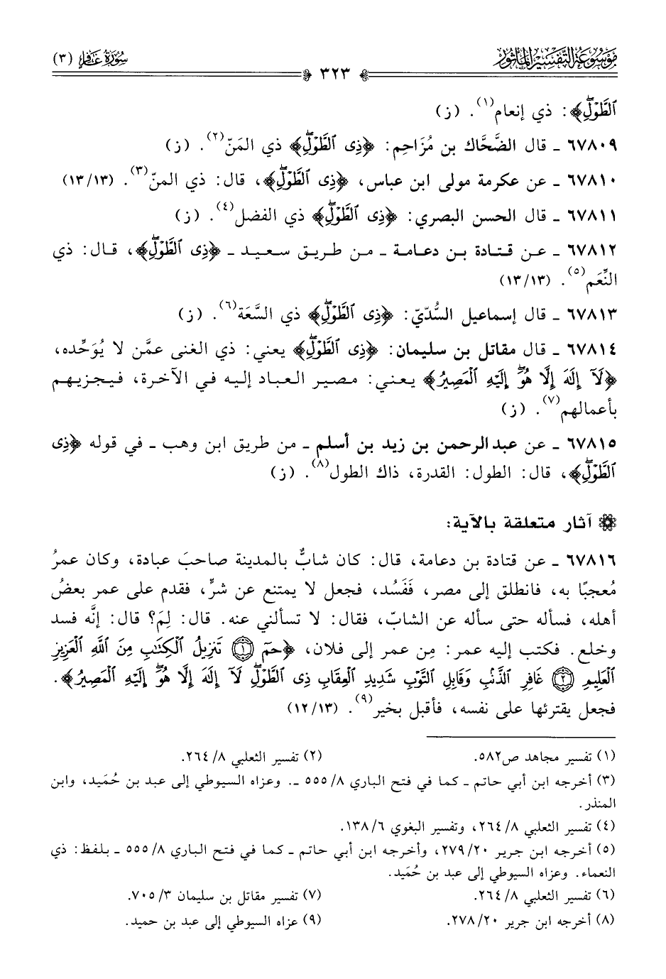 ٦٧٨١١ - قال الحسن البصري: {ذِي الطَّوْلِ} ذي الفضل (¬٤). (ز)
