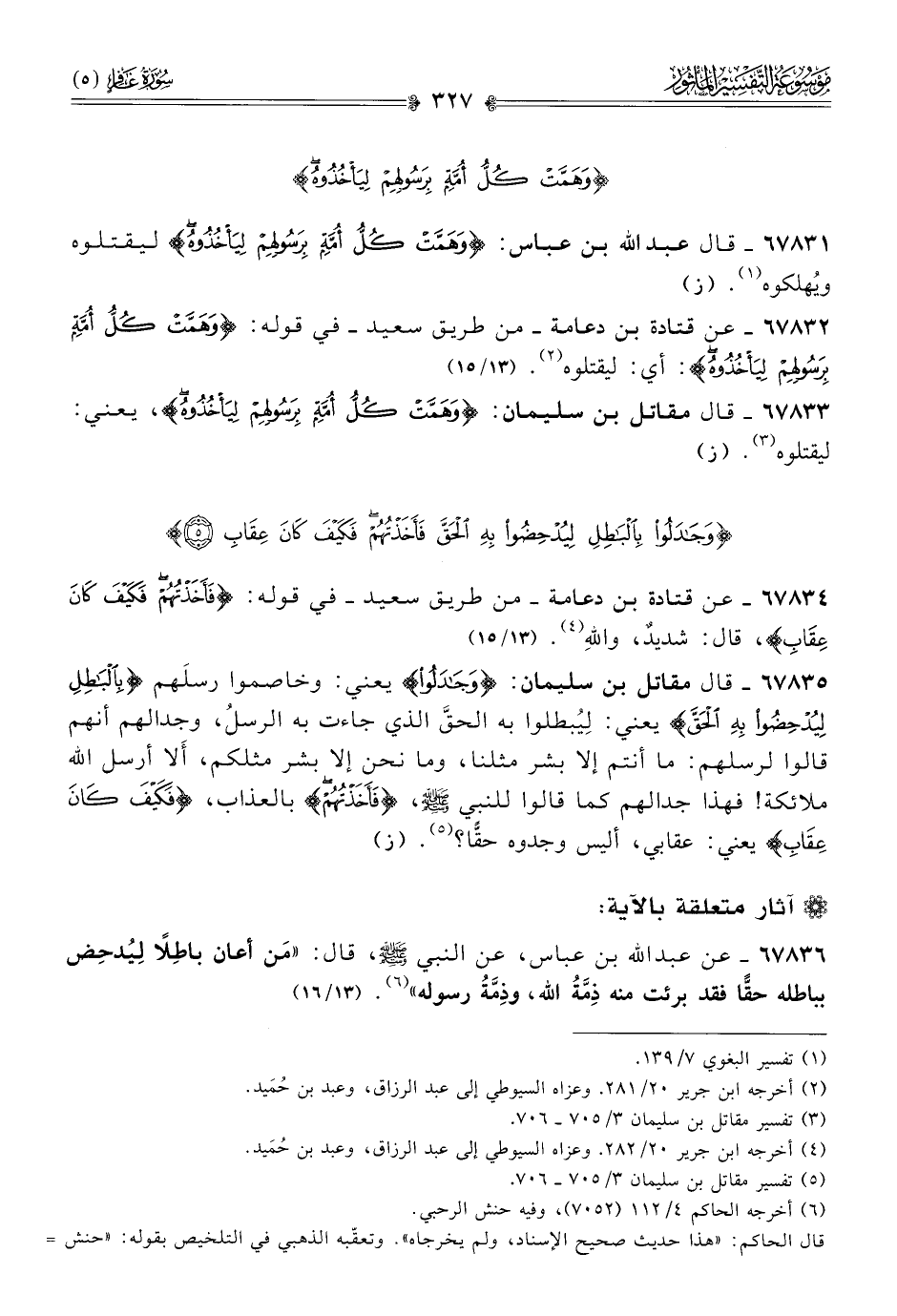 ٦٧٨٣٢ - عن قتادة بن دعامة -من طريق سعيد- في قوله: {وهَمَّتْ كُلُّ أُمَّةٍ بِرَسُولِهِمْ لِيَأْخُذُوه}: أي: ليقتلوه (¬٢). (١٣/ ١٥)