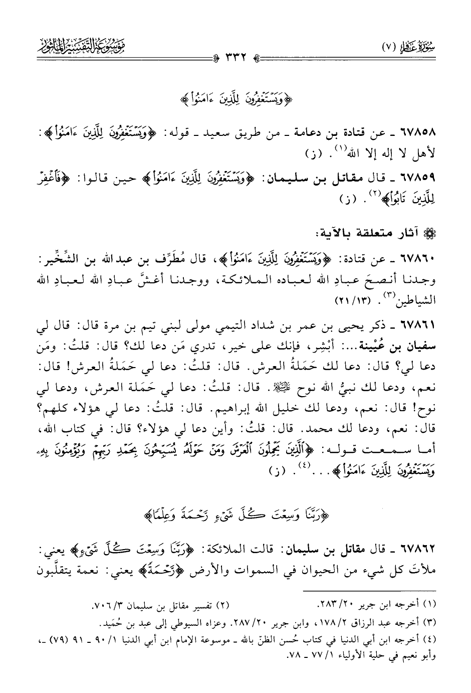 ٦٧٨٥٨ - عن قتادة بن دعامة -من طريق سعيد- قوله: {ويَسْتَغْفِرُونَ لِلَّذِينَ آمَنُوا}: لأهل لا إله إلا الله (¬١). (ز)