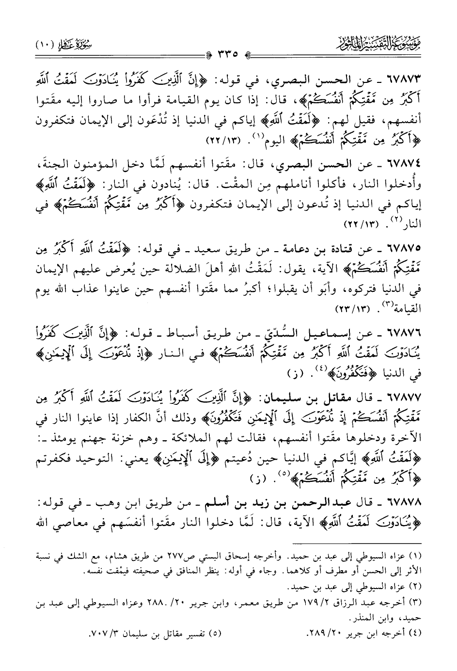٦٧٨٧٣ - عن الحسن البصري، في قوله: {إنَّ الَّذِينَ كَفَرُوا يُنادَوْنَ لَمَقْتُ اللَّهِ أكْبَرُ مِن مَقْتِكُمْ أنْفُسَكُمْ}، قال: إذا كان يوم القيامة فرأوا ما صاروا إليه مقَتوا أنفسهم، فقيل لهم: {لَمَقْتُ اللَّهِ} إياكم في الدنيا إذ تُدْعَون إلى الإيمان فتكفرون} {أكْبَرُ مِن مَقْتِكُمْ أنْفُسَكُمْ} اليوم (¬١). (١٣/ ٢٢)