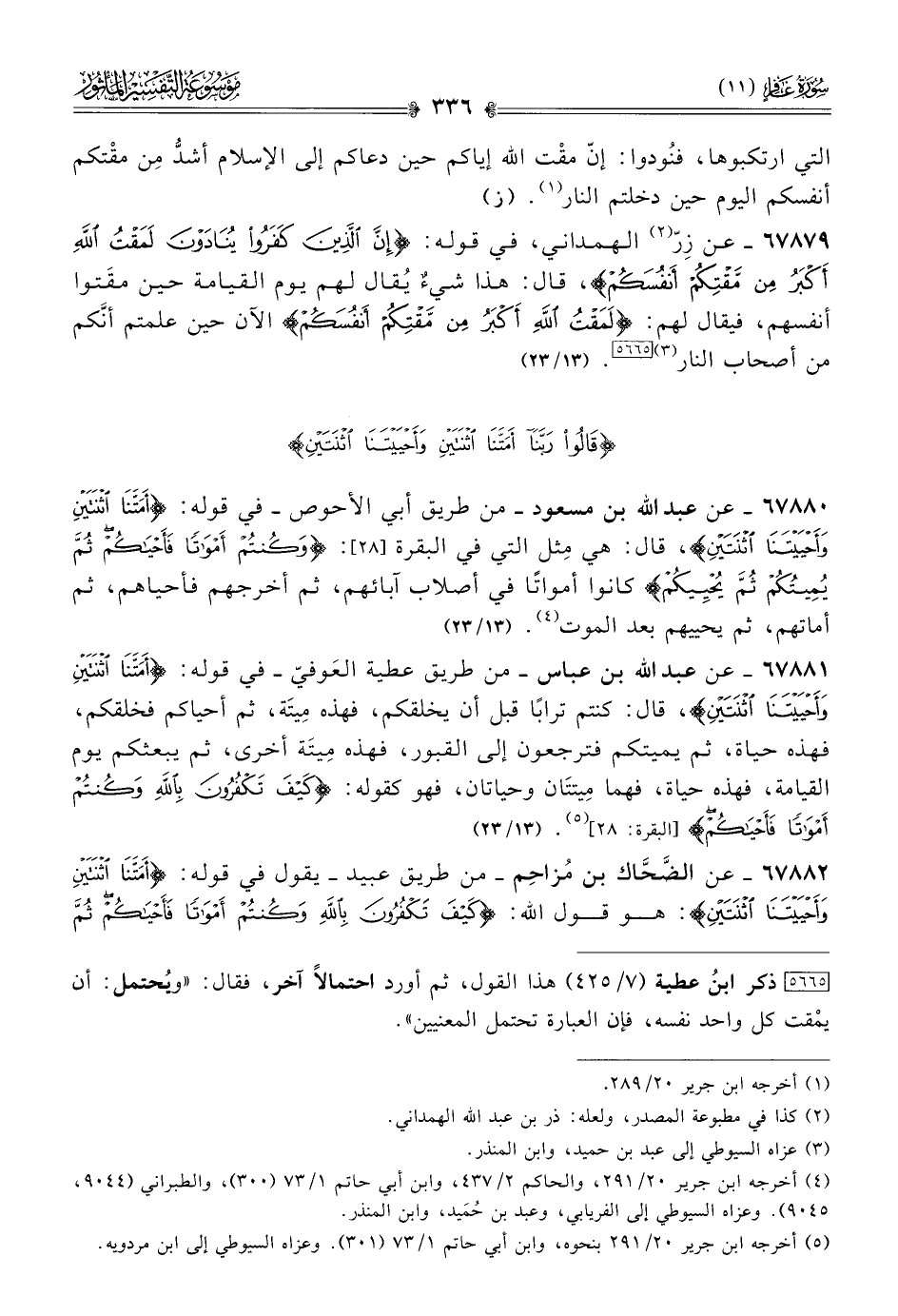 ٦٧٨٨١ - عن عبد الله بن عباس -من طريق عطية العَوفيّ- في قوله: {أمَتَّنا اثْنَتَيْنِ وأَحْيَيْتَنا اثْنَتَيْنِ}، قال: كنتم ترابًا قبل أن يخلقكم، فهذه مِيتَة، ثم أحياكم فخلقكم، فهذه حياة، ثم يميتكم فترجعون إلى القبور، فهذه مِيتَة أخرى، ثم يبعثكم يوم القيامة، فهذه حياة، فهما مِيتتان وحياتان، فهو كقوله: {كَيفَ تَكفُرونَ بِالله وكُنْتُمْ أمْواتًا فَأَحْياكُمْ} [البقرة: ٢٨] (¬٥). (١٣/ ٢٣)