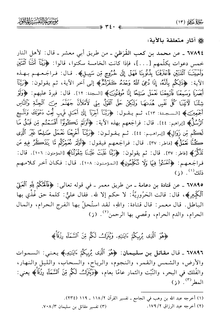 ٦٧٨٩٤ - عن محمد بن كعب القُرَظيّ -من طريق أبي معشر- قال: لأهل النار خمس دعوات يكلّمهم [ ... ]، فإذا كانت الخامسة سكتوا، قالوا: {رَبَّنا أمَتَّنا اثْنَتَيْنِ وأَحْيَيْتَنا اثْنَتَيْنِ فاعْتَرَفْنا بِذُنُوبِنا فَهَلْ إلى خُرُوجٍ مِن سَبِيلٍ}. قال: فراجَعهم بهذه الآية: {ذَلِكُمْ بِأَنَّهُ إذا دُعِيَ اللَّهُ وحْدَهُ كَفَرْتُمْ} إلى آخر الآية، ثم يقولون: {رَبَّنا أبْصَرْنا وسَمِعْنا فارْجِعْنا نَعْمَلْ صالِحًا إنّا مُوقِنُونَ} [السجدة: ١٢]. قال: فيردّ عليهم: {ولَوْ شِئْنا لَآتَيْنا كُلَّ نَفْسٍ هُداها ولَكِنْ حَقَّ القَوْلُ مِنِّي لَأَمْلَأَنَّ جَهَنَّمَ مِنَ الجِنَّةِ والنّاسِ أجْمَعِينَ} [السجدة: ١٣]، ثم يقول: {رَبَّنا أخِّرْنا إلى أجَلٍ قَرِيبٍ نُجِبْ دَعْوَتَكَ ونَتَّبِعِ الرُّسُلَ} [إبراهيم: ٤٤]. قال: فراجَعهم بهذه الآية: {أوَلَمْ تَكُونُوا أقْسَمْتُمْ مِن قَبْلُ ما لَكُمْ مِن زَوالٍ} [إبراهيم: ٤٤]. ثم يقولون: {رَبَّنا أخْرِجْنا نَعْمَلْ صالِحًا غَيْرَ الَّذِي كُنّا نَعْمَلُ} [فاطر: ٣٧]. قال: فراجَعهم فيقول: {أوَلَمْ نُعَمِّرْكُمْ ما يَتَذَكَّرُ فِيهِ مَن تَذَكَّرَ} [فاطر: ٣٧]. قال: ثم يقولون: {رَبَّنا غَلَبَتْ عَلَيْنا شِقْوَتُنا} [المؤمنون: ١٠٦]. قال: فراجَعهم: {اخْسَئُوا فِيها ولا تُكَلِّمُونِ} [المؤمنون: ١٠٨]. قال: فكان آخر كلامهم ذلك (¬١). (ز)