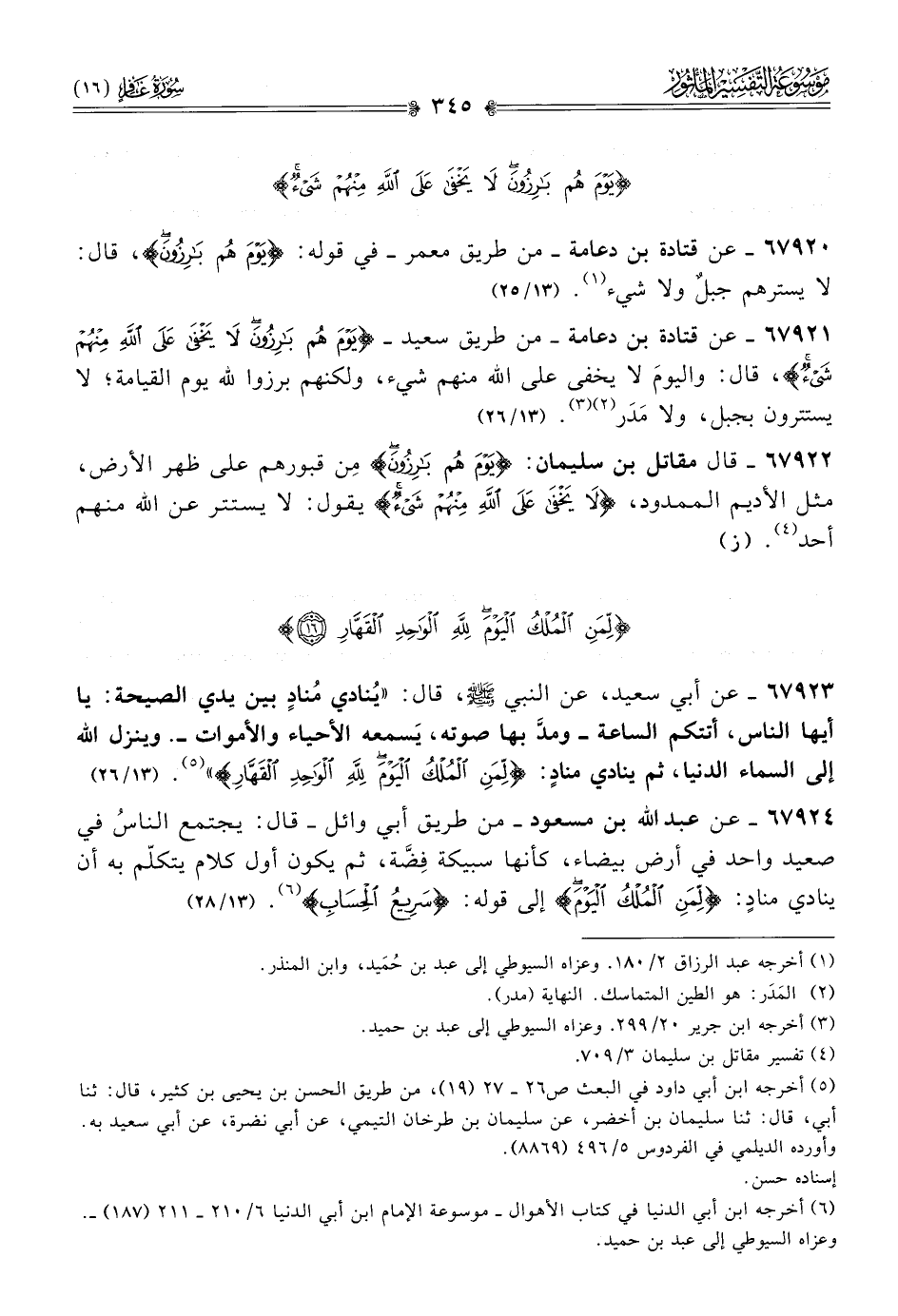 ٦٧٩٢٣ - عن أبي سعيد، عن النبي - صلى الله عليه وسلم -، قال: «يُنادي مُنادٍ بين يدي الصيحة: يا أيها الناس، أتتكم الساعة -ومدَّ بها صوته، يَسمعه الأحياء والأموات-. وينزل الله إلى السماء الدنيا، ثم ينادي منادٍ: {لِمَنِ المُلْكُ اليَوْمَ لِلَّهِ الواحِدِ القَهّارِ}» (¬٥). (١٣/ ٢٦)
