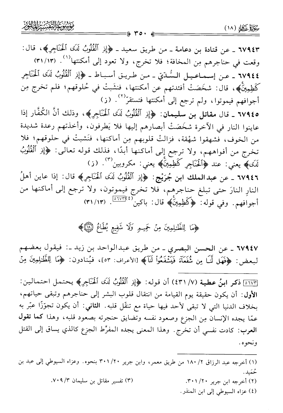 ٦٧٩٤٦ - عن عبد الملك ابن جُرَيْج: {إذِ القُلُوبُ لَدى الحَناجِرِ} قال: إذا عاين أهلُ النارِ النارَ حتى تبلغ حناجرهم، فلا تخرج فيموتون، ولا ترجع إلى أماكنها من أجوافهم. وفي قوله: {كاظِمِينَ} قال: باكين (¬٤) [٥٦٧٣]. (١٣/ ٣١)