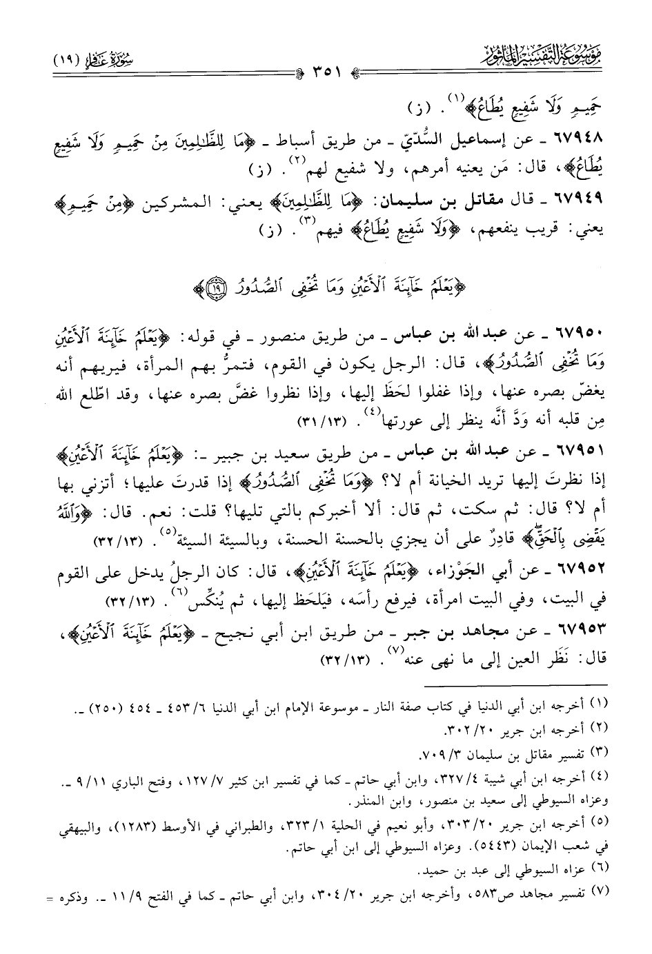 ٦٧٩٥١ - عن عبد الله بن عباس -من طريق سعيد بن جبير-: {يَعْلَمُ خائِنَةَ الأَعْيُنِ} إذا نظرتَ إليها تريد الخيانة أم لا؟ {وما تُخْفِي الصُّدُورُ} إذا قدرتَ عليها؛ أتزني بها أم لا؟ قال: ثم سكت، ثم قال: ألا أخبركم بالتي تليها؟ قلت: نعم. قال: {واللَّهُ يَقْضِي بِالحَقِّ} قادِرٌ على أن يجزي بالحسنة الحسنة، وبالسيئة السيئة (¬٥). (١٣/ ٣٢)