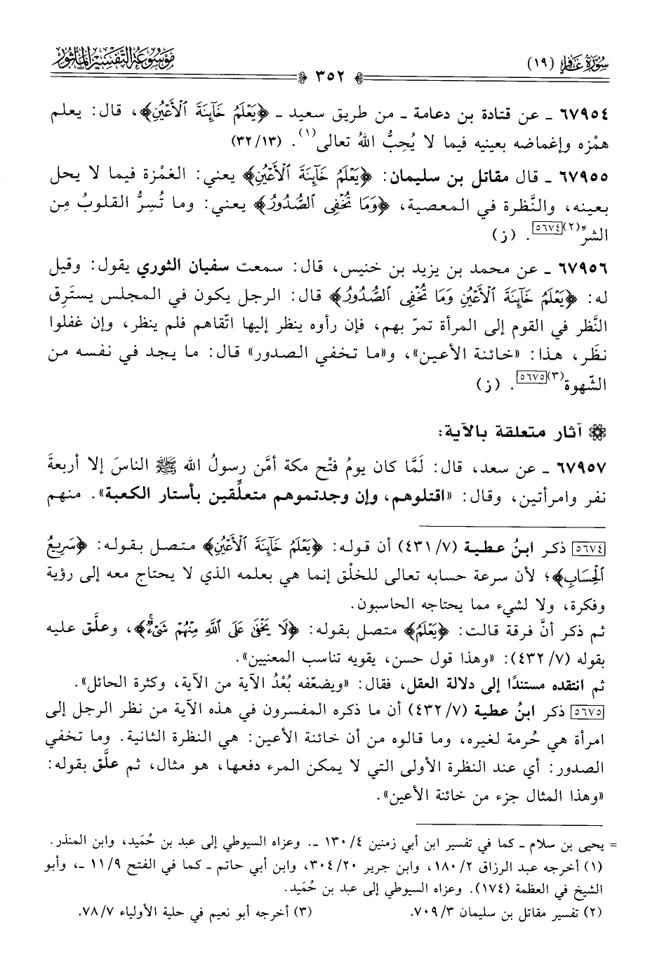 ٦٧٩٥٤ - عن قتادة بن دعامة -من طريق سعيد- {يَعْلَمُ خائِنَةَ الأَعْيُنِ}، قال: يعلم همْزه وإغماضه بعينيه فيما لا يُحِبُّ اللهُ تعالى (¬١). (١٣/ ٣٢)