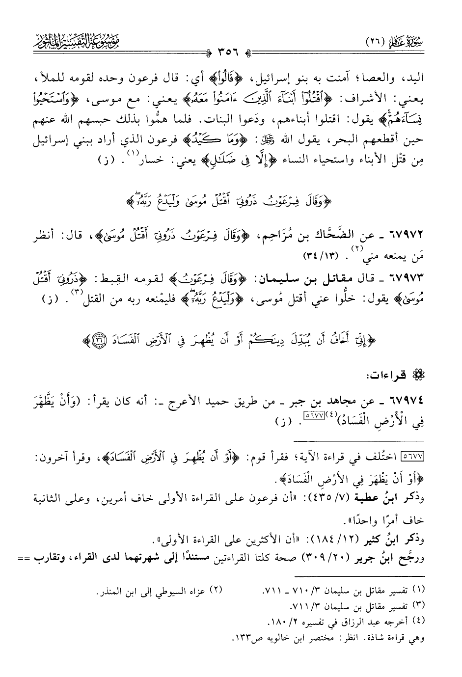[٥٦٧٧] اختُلف في قراءة قوله: {أو أن يظهر في الأرض الفساد}؛ فقرأ قوم: {أو أن يُظْهِر في الأرض الفسادَ}، وقرأ آخرون: «أوْ أن يَظْهَرَ فِي الأَرْضِ الفَسادُ».