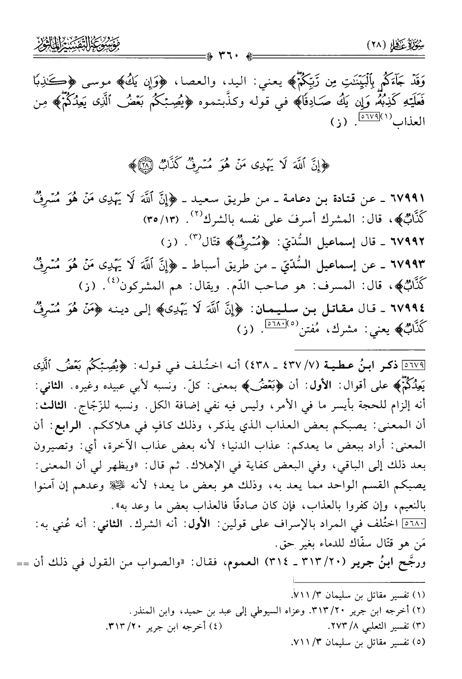 ٦٧٩٩١ - عن قتادة بن دعامة -من طريق سعيد- {إنَّ اللَّهَ لا يَهْدِي مَن هُوَ مُسْرِفٌ كَذّابٌ}، قال: المشرك أسرفَ على نفسه بالشرك (¬٢). (١٣/ ٣٥)