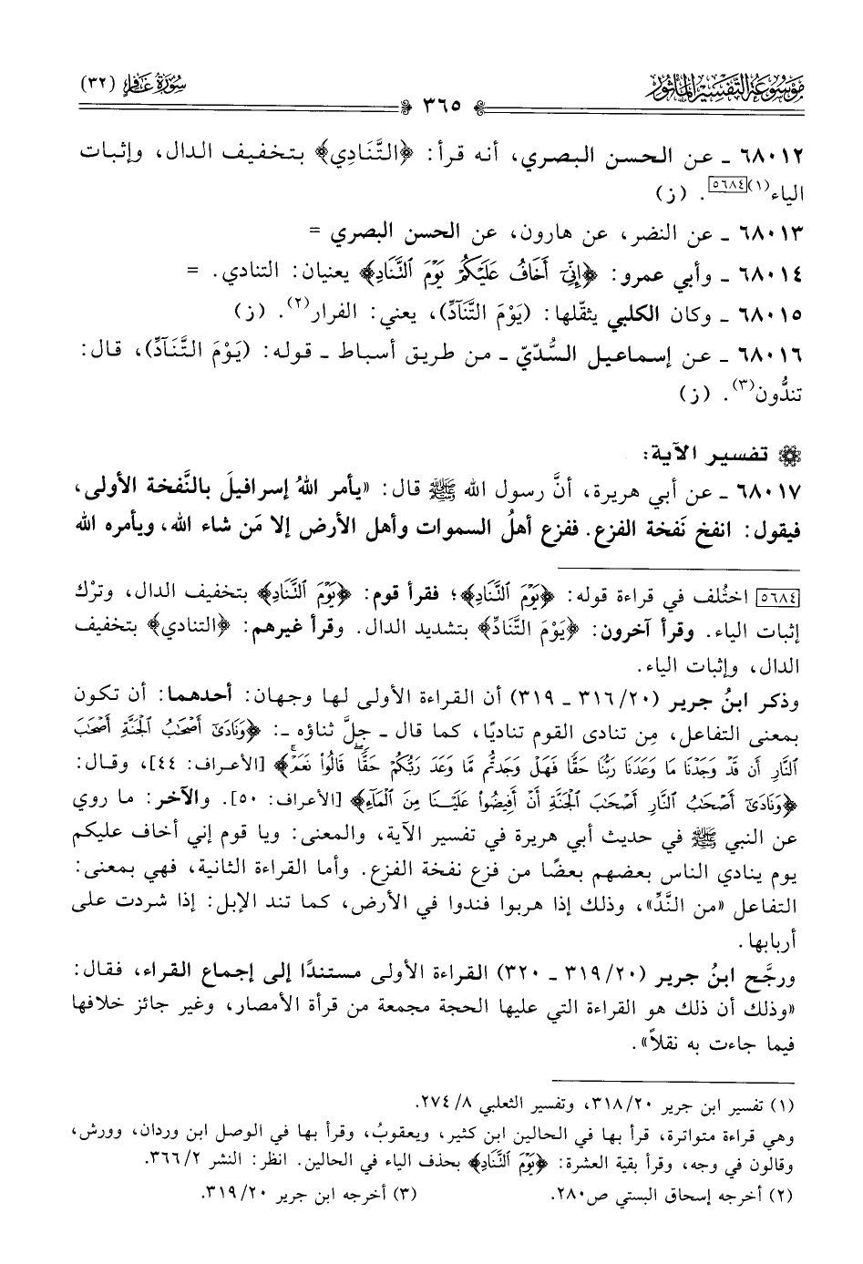 وذكر ابنُ جرير (٢٠/ ٣١٦ - ٣١٩) أن القراءة الأولى لها وجهان: أحدهما: أن تكون بمعنى التفاعل، مِن تنادى القوم تناديًا، كما قال -جل ثناؤه-: {ونادى أصحاب الجنة أصحاب النار أن قد وجدنا ما وعدنا ربنا حقا فهل وجدتم ما وعد ربكم حقا قالوا نعم} [الأعراف: ٤٤]، وقال: {ونادى أصحاب النار أصحاب الجنة أن أفيضوا علينا من الماء} [الأعراف: ٥٠]. والآخر: ما روي عن النبي - صلى الله عليه وسلم - في حديث أبي هريرة في تفسير الآية، والمعنى: ويا قوم إني أخاف عليكم يوم ينادي الناس بعضهم بعضًا من فزع نفخة الفزع. وأما القراءة الثانية، فهي بمعنى: التفاعل «من النَّدِّ»، وذلك إذا هربوا فندوا في الأرض، كما تند الإبل: إذا شردت على أربابها.