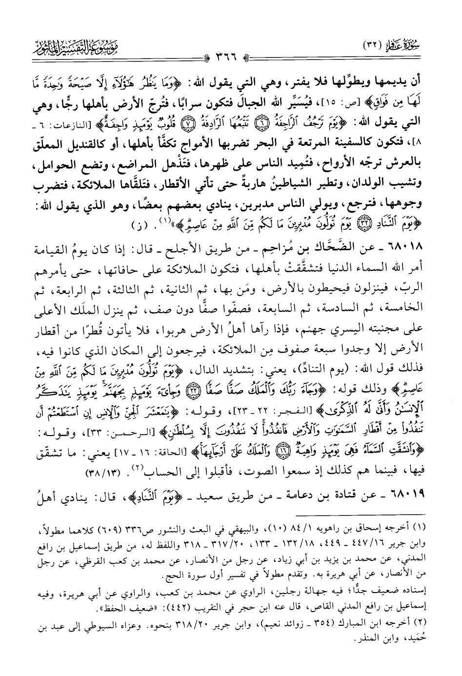 ٦٨٠١٨ - عن الضَّحّاك بن مُزاحِم -من طريق الأجلح- قال: إذا كان يومُ القيامة أمر الله السماء الدنيا فتشقَّقتْ بأهلها، فتكون الملائكة على حافاتها، حتى يأمرهم الربّ، فينزلون فيحيطون بالأرض، ومَن بها، ثم الثانية، ثم الثالثة، ثم الرابعة، ثم الخامسة، ثم السادسة، ثم السابعة، فصفّوا صفًّا دون صف، ثم ينزل الملَك الأعلى على مجنبته اليسري جهنم، فإذا رآها أهلُ الأرض هربوا، فلا يأتون قُطرًا من أقطار الأرض إلا وجدوا سبعة صفوف مِن الملائكة، فيرجعون إلى المكان الذي كانوا فيه، فذلك قول الله: (يوم التنادِّ)، يعني: بتشديد الدال، {يَوْمَ تُوَلُّونَ مُدْبِرِينَ ما لَكُمْ مِنَ اللَّهِ مِن عاصِمٍ} وذلك قوله: {وجاءَ رَبُّكَ والمَلَكُ صَفًّا صَفًّا وجِيءَ يَوْمَئِذٍ بِجَهَنَّمَ يَوْمَئِذٍ يَتَذَكَّرُ الإنْسانُ وأَنّى لَهُ الذِّكْرى} [الفجر: ٢٢ - ٢٣]، وقوله: {يا مَعْشَرَ الجِنِّ والإنْسِ إنِ اسْتَطَعْتُمْ أنْ تَنْفُذُوا مِن أقْطارِ السَّماواتِ والأَرْضِ فانْفُذُوا لا تَنْفُذُونَ إلّا بِسُلْطانٍ} [الرحمن: ٣٣]، وقوله: {وانْشَقَّتِ السَّماءُ فَهِيَ يَوْمَئِذٍ واهِيَةٌ والمَلَكُ عَلى أرْجائِها} [الحاقة: ١٦ - ١٧] يعني: ما تشقّق فيها، فبينما هم كذلك إذ سمعوا الصوت، فأقبلوا إلى الحساب (¬٢). (١٣/ ٣٨)