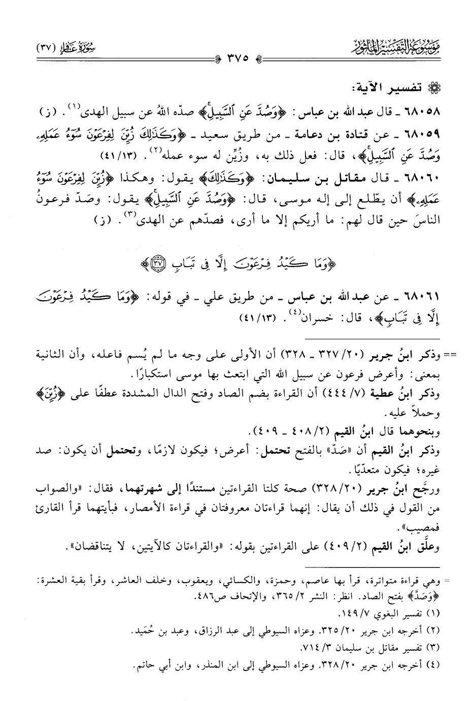 ٦٨٠٦٠ - قال مقاتل بن سليمان: {وكَذلِكَ} يقول: وهكذا {زُيِّنَ لِفِرْعَوْنَ سُوءُ عَمَلِهِ} أن يطّلع إلى إله موسى، قال: {وصُدَّ عَنِ السَّبِيلِ} يقول: وصَدّ فرعونُ الناسَ حين قال لهم: ما أريكم إلا ما أرى، فصدّهم عن الهدى (¬٣). (ز)
