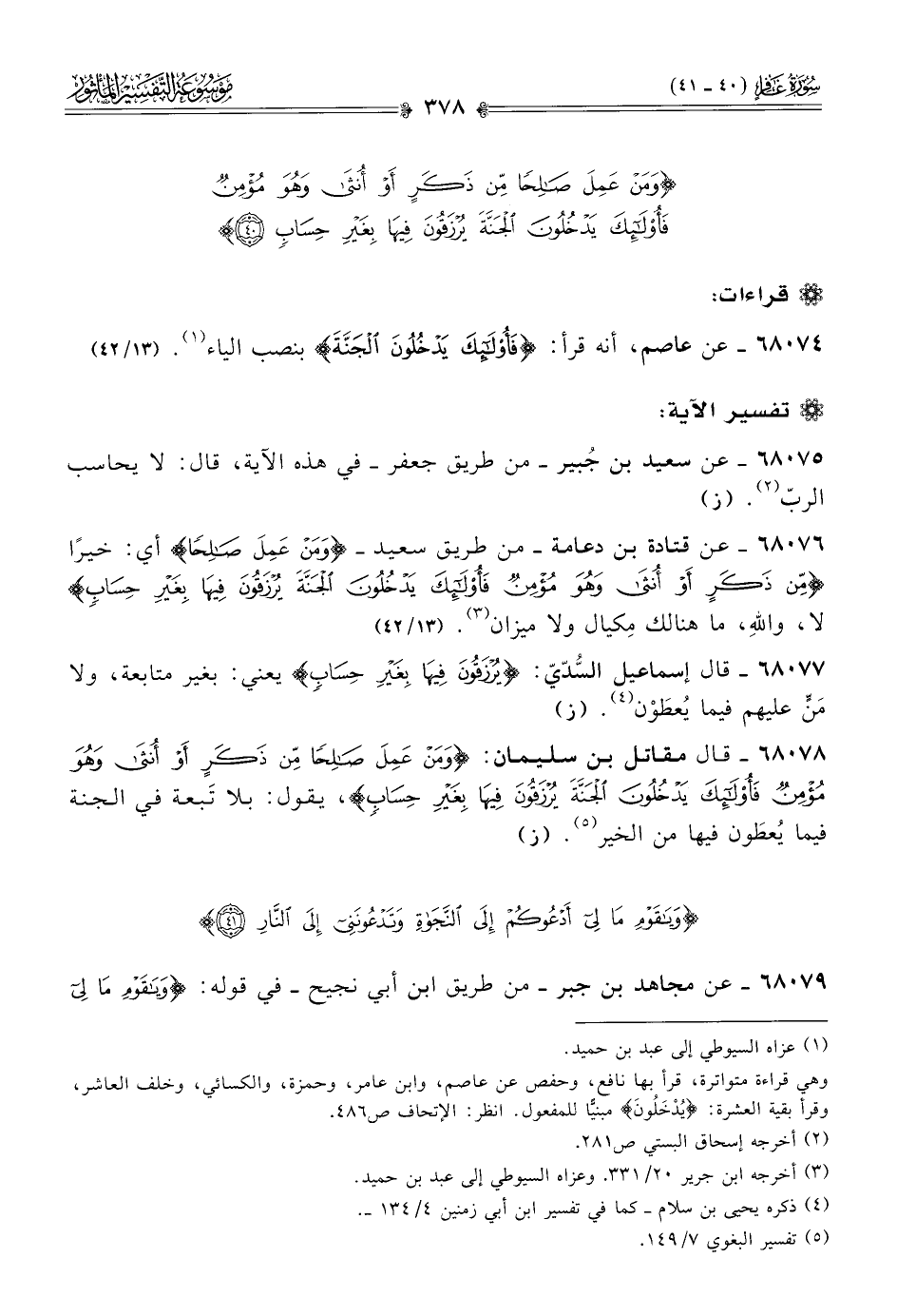 ٦٨٠٧٦ - عن قتادة بن دعامة -من طريق سعيد- {ومَن عَمِلَ صالِحًا} أي: خيرًا {مِن ذَكَرٍ أوْ أُنْثى وهُوَ مُؤْمِنٌ فَأُولَئِكَ يَدْخُلُونَ الجَنَّةَ يُرْزَقُونَ فِيها بِغَيْرِ حِسابٍ} لا، واللهِ، ما هنالك مِكيال ولا ميزان (¬٣). (١٣/ ٤٢)