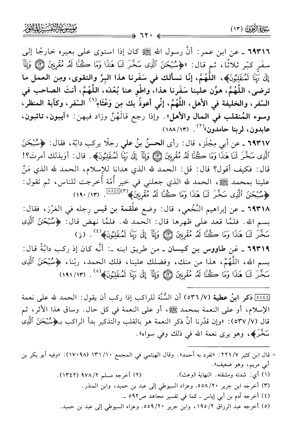 [٥٨٤٤] ذكر ابنُ عطية (٧/ ٥٣٦) أن السُّنة للراكب إذا ركب أن يقول: الحمد لله على نعمة الإسلام، أو على النعمة بمحمد - رضي الله عنهما -، أو على النعمة في كل حال. وساق هذا الأثر، ثم قال (٧/ ٥٣٧): «وإن قدّرنا أنّ ذكر النعمة هو بالقلب والتذكير بدأ الراكب بـ {سبحان الذي سخر}، وهو يرى نعمة الله في ذلك وفي سواه».