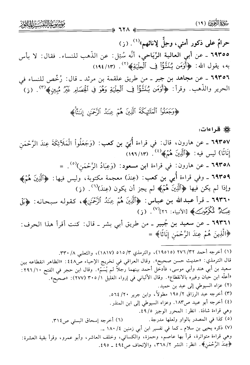٦٩٣٥٧ - عن هارون، قال: في قراءة أُبَيّ بن كعب: (وجَعَلُواْ المَلَآئِكَةَ عِندَ الرَّحْمَنِ إناثًا) ليس فيه: {الَّذِينَ هُمْ} (¬٤). (١٣/ ١٩٦)