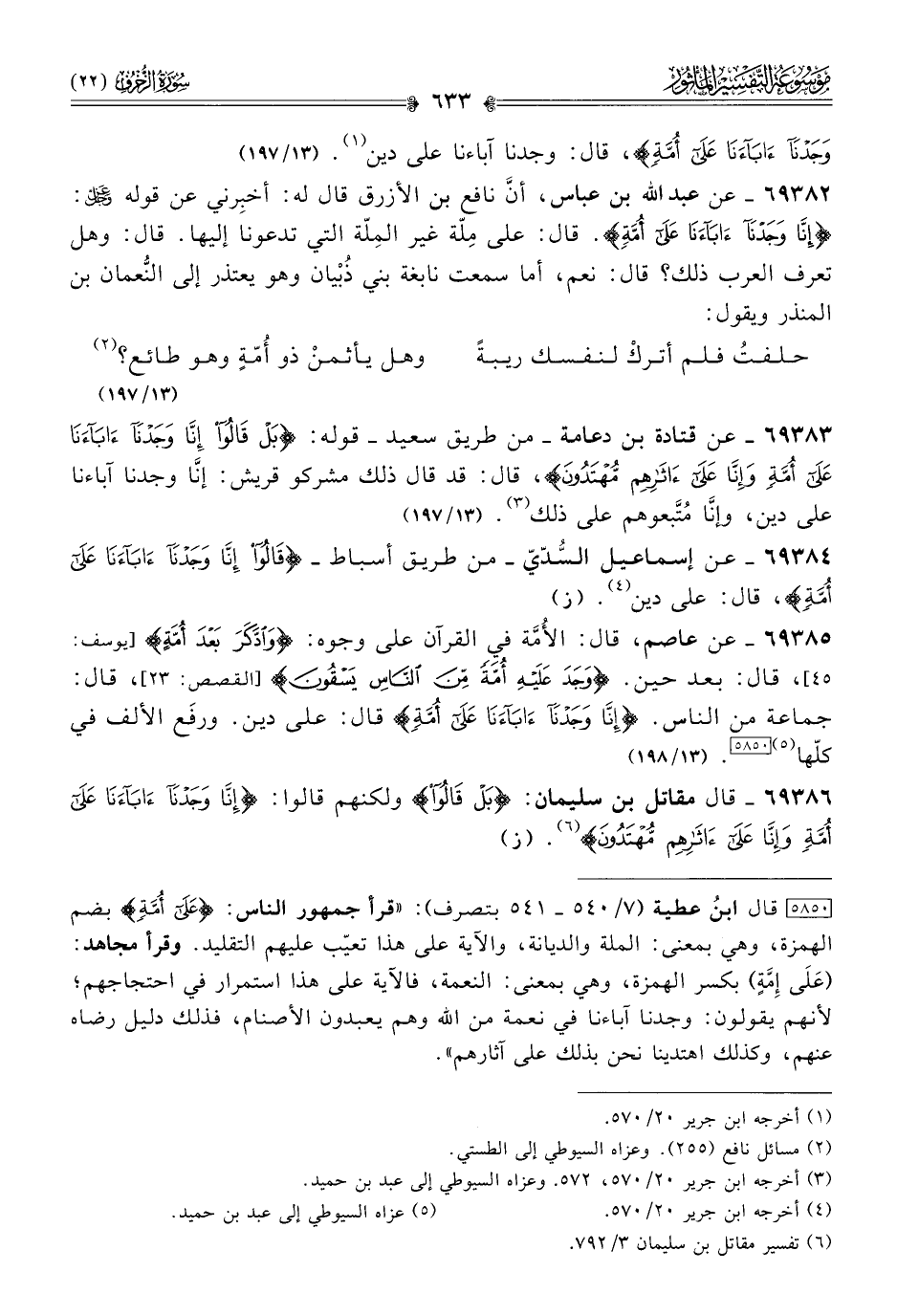 ٦٩٣٨٣ - عن قتادة بن دعامة -من طريق سعيد- قوله: {بَلْ قالُوا إنّا وجَدْنا آباءَنا عَلى أُمَّةٍ وإنّا عَلى آثارِهِمْ مُهْتَدُونَ}، قال: قد قال ذلك مشركو قريش: إنّا وجدنا آباءنا على دين، وإنّا مُتَّبعوهم على ذلك (¬٣). (١٣/ ١٩٧)