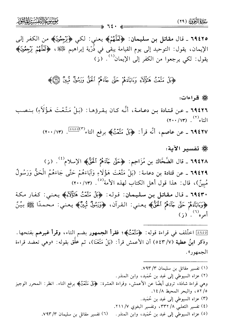 ٦٩٤٢٩ - عن قتادة بن دعامة: (بَلْ مَتَّعْتَ هَؤُلاءِ وآباءَهُمْ حَتّى جاءَهُمُ الحَقُّ ورَسُولٌ مُبِينٌ)، قال: هذا قول أهل الكتاب لهذه الأمة (¬٥). (١٣/ ٢٠٠)