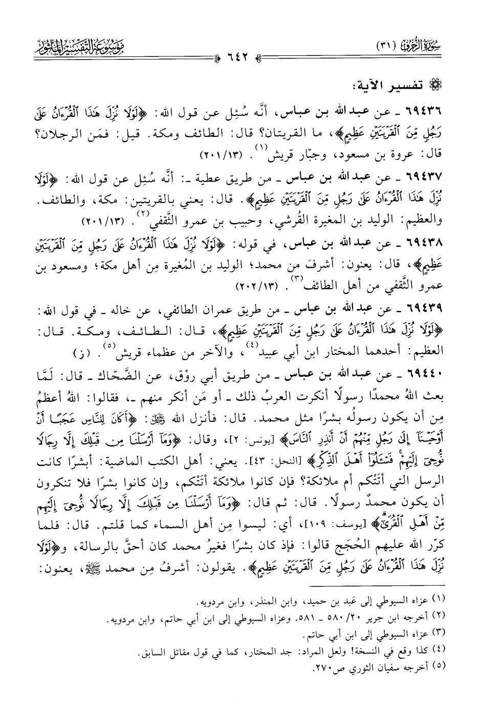 ٦٩٤٣٨ - عن عبد الله بن عباس، في قوله: {لَوْلا نُزِّلَ هَذا القُرْآنُ عَلى رَجُلٍ مِنَ القَرْيَتَيْنِ عَظِيمٍ}، قال: يعنون: أشرفَ من محمد؛ الوليد بن المُغيرة مِن أهل مكة؛ ومسعود بن عمرو الثَّقفي من أهل الطائف (¬٣). (١٣/ ٢٠٢)