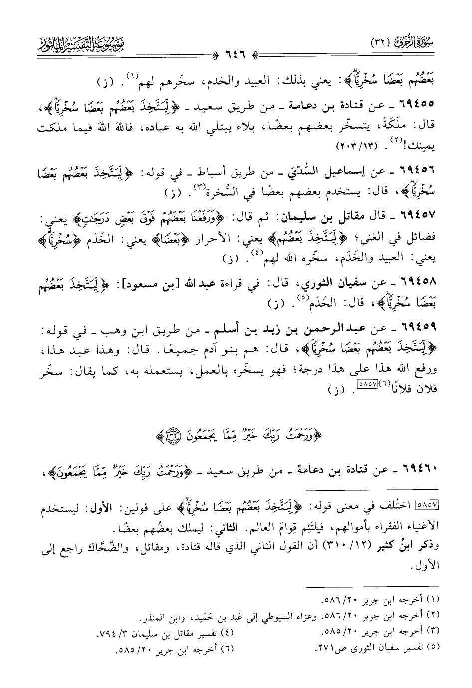 ٦٩٤٥٨ - عن سفيان الثوري، قال: في قراءة عبد الله [بن مسعود]: {لِيَتَّخِذَ بَعْضُهُمْ بَعْضًا سُخْرِيًّا}، قال: الخَدَم (¬٥). (ز)
