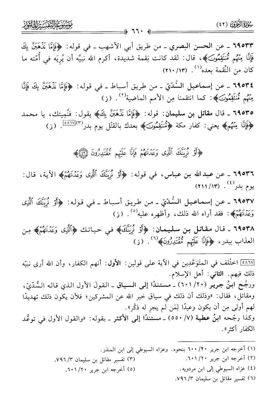 ٦٩٥٣٦ - عن عبد الله بن عباس، في قوله: {أوْ نُرِيَنَّكَ الَّذِي وعَدْناهُمْ} الآية، قال: يوم بدر (¬٤). (١٣/ ٢١١)