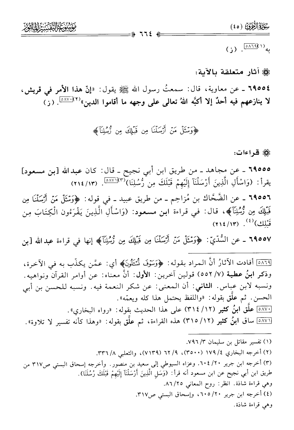 ٦٩٥٥٥ - عن مجاهد -من طريق ابن أبي نجيح- قال: كان عبد الله [بن مسعود] يقرأ: (واسْأَلِ الَّذِينَ أرْسَلْنَآ إلَيْهِمْ قَبْلَكَ مِن رُّسُلِنا) (¬٣) [٥٨٧١]. (١٣/ ٢١٤)