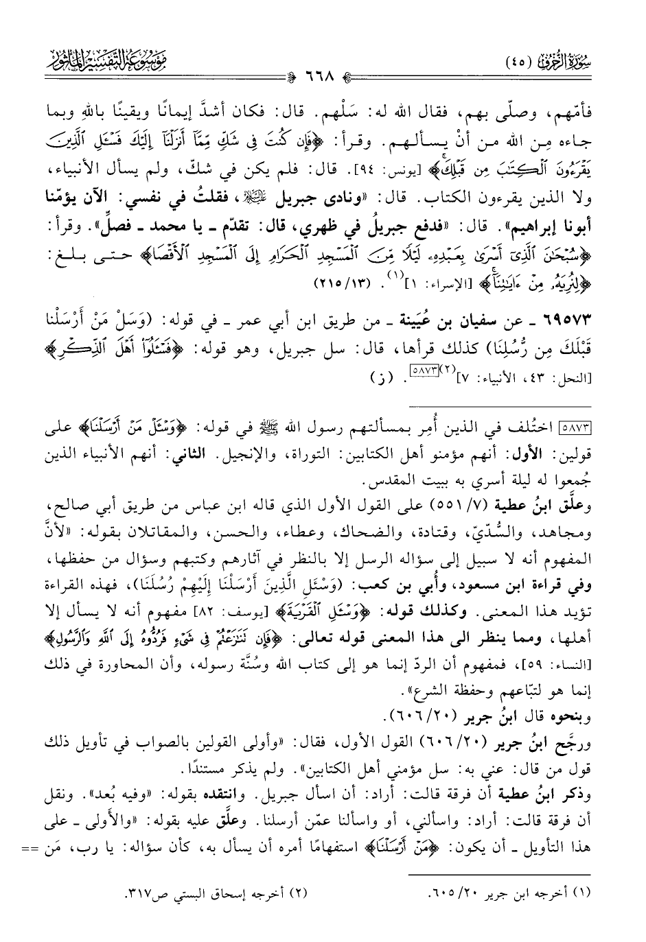 وعلَّق ابنُ عطية (٧/ ٥٥١) على القول الأول الذي قاله ابن عباس من طريق أبي صالح، ومجاهد، والسُّدّيّ، وقتادة، والضحاك، وعطاء، والحسن، والمقاتلان بقوله: «لأنّ المفهوم أنه لا سبيل إلى سؤاله الرسل إلا بالنظر في آثارهم وكتبهم وسؤال من حفظها، وفي قراءة ابن مسعود، وأبي بن كعب: (وسْئَلِ الَّذِينَ أرْسَلْنا إلَيْهِمْ رُسُلَنا)، فهذه القراءة تؤيد هذا المعنى. وكذلك قوله: {وسئل القرية} [يوسف: ٨٢] مفهوم أنه لا يسأل إلا أهلها، ومما ينظر الى هذا المعنى قوله تعالى: {فإن تنازعتم في شيء فردوه إلى الله والرسول} [النساء: ٥٩]، فمفهوم أن الردّ إنما هو إلى كتاب الله وسنة رسوله، وأن المحاورة في ذلك إنما هو لتبّاعهم وحفظة الشرع».