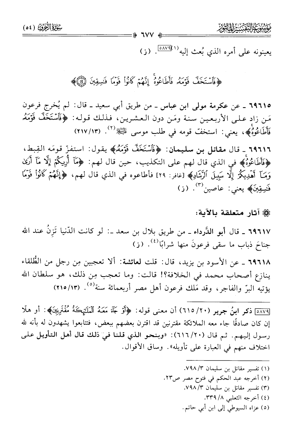 ٦٩٦١٦ - قال مقاتل بن سليمان: {فاسْتَخَفَّ قَوْمَهُ} يقول: استفزّ قومَه القِبط، {فَأَطاعُوهُ} في الذي قال لهم على التكذيب، حين قال لهم: {ما أُرِيكُمْ إلّا ما أرى وما أهْدِيكُمْ إلّا سَبِيلَ الرَّشادِ} [غافر: ٢٩] فأطاعوه في الذي قال لهم، {إنَّهُمْ كانُوا قَوْمًا فاسِقِينَ} يعني: عاصين (¬٣). (ز)