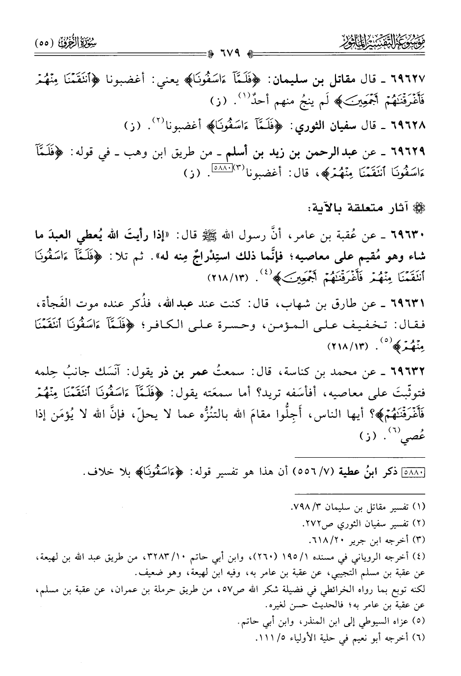 ٦٩٦٣٠ - عن عُقبة بن عامر، أنّ رسول الله - صلى الله عليه وسلم - قال: «إذا رأيتَ الله يُعطي العبدَ ما شاء وهو مُقيم على معاصيه؛ فإنّما ذلك استِدْراجٌ مِنه له». ثم تلا: {فَلَمّا آسَفُونا انْتَقَمْنا مِنهُمْ فَأَغْرَقْناهُمْ أجْمَعِينَ} (¬٤). (١٣/ ٢١٨)