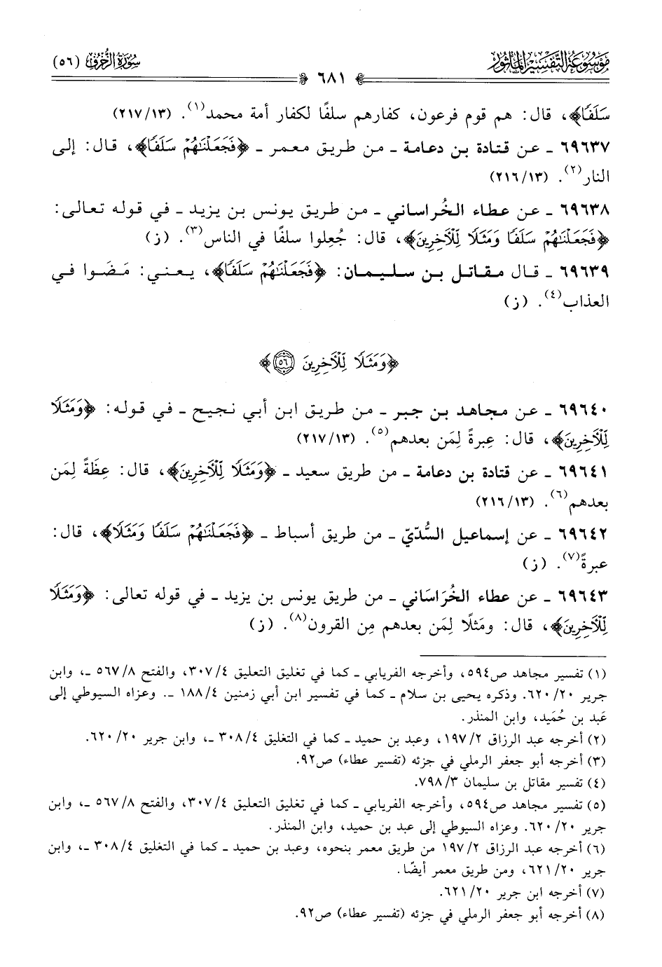 ٦٩٦٣٨ - عن عطاء الخُراساني -من طريق يونس بن يزيد- في قوله تعالى: {فجعلناهم سلفا ومثلا للآخرين}، قال: جُعِلوا سلفًا في الناس (¬٣). (ز)