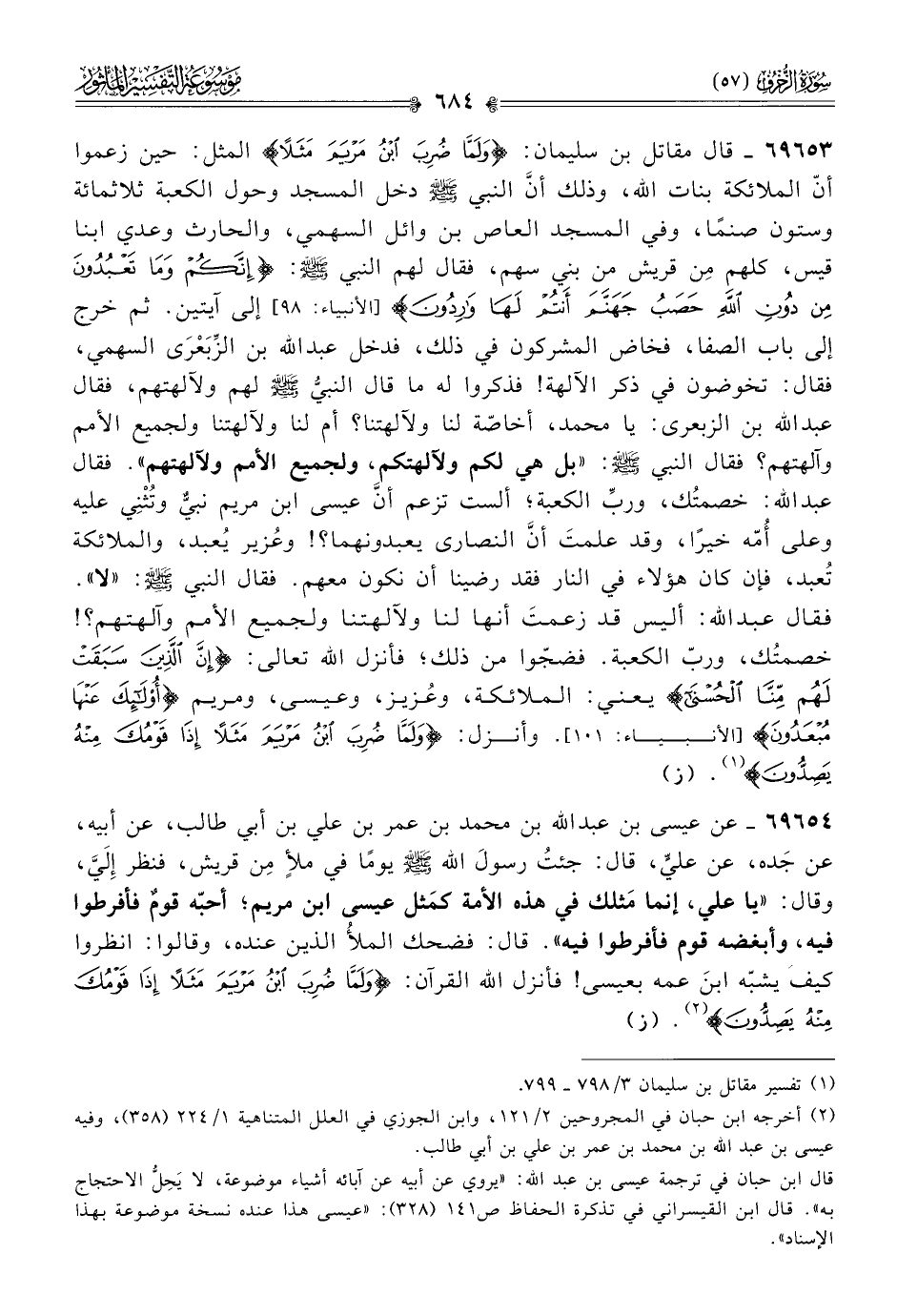 ٦٩٦٥٣ - قال مقاتل بن سليمان: {ولَمّا ضُرِبَ ابْنُ مَرْيَمَ مَثَلًا} المثل: حين زعموا أنّ الملائكة بنات الله، وذلك أنّ النبي - صلى الله عليه وسلم - دخل المسجد وحول الكعبة ثلاثمائة وستون صنمًا، وفي المسجد العاص بن وائل السهمي، والحارث وعدي ابنا قيس، كلهم مِن قريش من بني سهم، فقال لهم النبي - صلى الله عليه وسلم -: {إنَّكُمْ وما تَعْبُدُونَ مِن دُونِ اللَّهِ حَصَبُ جَهَنَّمَ أنْتُمْ لَها وارِدُونَ} [الأنبياء: ٩٨] إلى آيتين. ثم خرج إلى باب الصفا، فخاض المشركون في ذلك، فدخل عبد الله بن الزِّبَعْرى السهمي، فقال: تخوضون في ذكر الآلهة! فذكروا له ما قال النبيُّ - صلى الله عليه وسلم - لهم ولآلهتهم، فقال عبد الله بن الزبعرى: يا محمد، أخاصّة لنا ولآلهتنا؟ أم لنا ولآلهتنا ولجميع الأمم وآلهتهم؟ فقال النبي - صلى الله عليه وسلم -: «بل هي لكم ولآلهتكم، ولجميع الأمم ولآلهتهم». فقال عبد الله: خصمتُك، وربِّ الكعبة؛ ألست تزعم أنّ عيسى ابن مريم نبيٌّ وتُثْنِي عليه وعلى أُمّه خيرًا، وقد علمتَ أنّ النصارى يعبدونهما؟! وعُزير يُعبد، والملائكة تُعبد، فإن كان هؤلاء في النار فقد رضينا أن نكون معهم. فقال النبي - صلى الله عليه وسلم -: «لا». فقال عبد الله: أليس قد زعمتَ أنها لنا ولآلهتنا ولجميع الأمم وآلهتهم؟! خصمتُك، وربّ الكعبة. فضجّوا من ذلك؛ فأنزل الله تعالى: {إنَّ الَّذِينَ سَبَقَتْ لَهُمْ مِنّا الحُسْنى} يعني: الملائكة، وعُزيز، وعيسى، ومريم {أُولئِكَ عَنْها مُبْعَدُونَ}. وأنزل: {ولَمّا ضُرِبَ ابْنُ مَرْيَمَ مَثَلًا إذا قَوْمُكَ مِنهُ يَصِدُّونَ} (¬١). (ز)