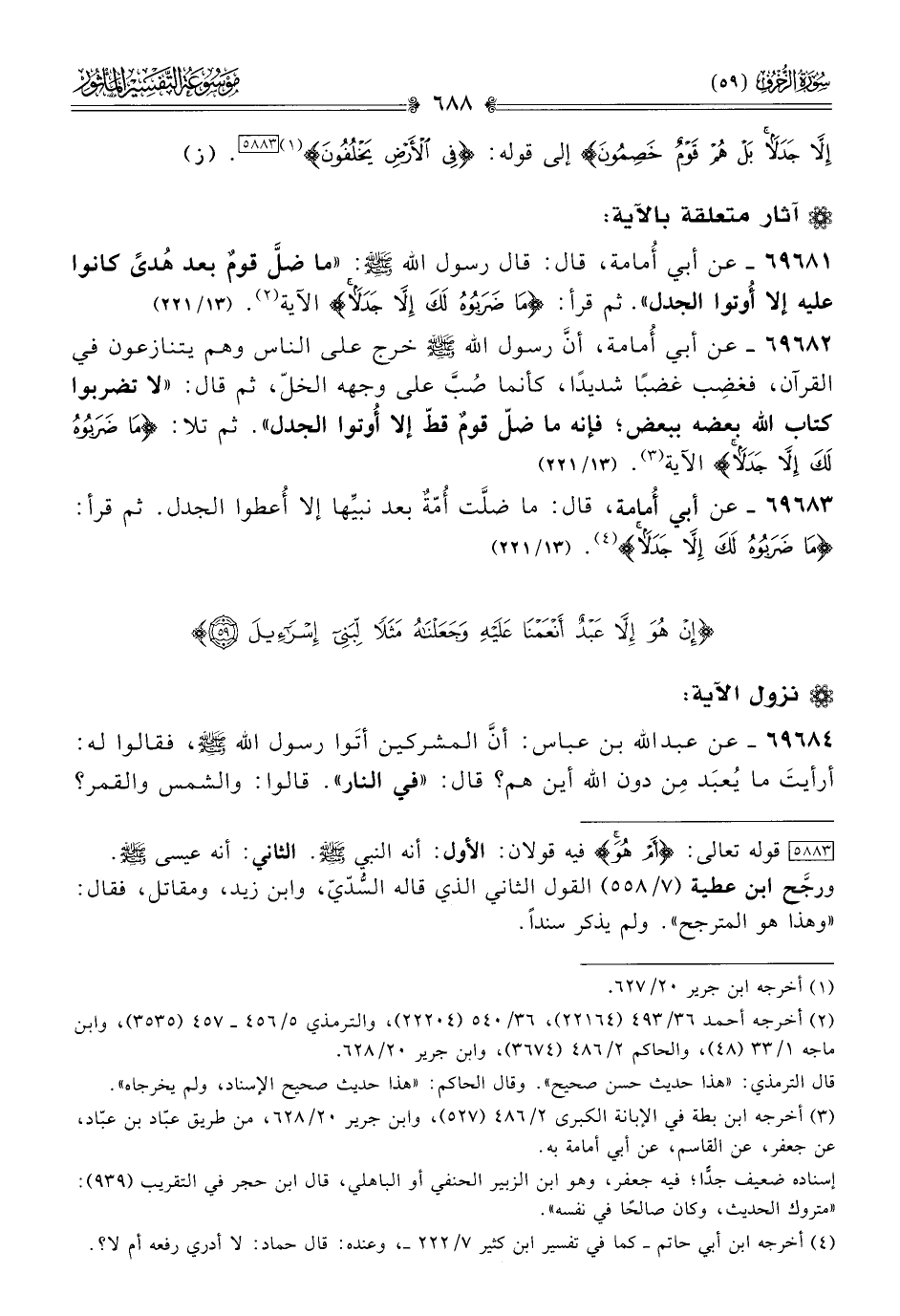 ٦٩٦٨٣ - عن أبي أُمامة، قال: ما ضلَّت أُمّةٌ بعد نبيِّها إلا أُعطوا الجدل. ثم قرأ: {ما ضَرَبُوهُ لَكَ إلّا جَدَلًا} (¬٤). (١٣/ ٢٢١)