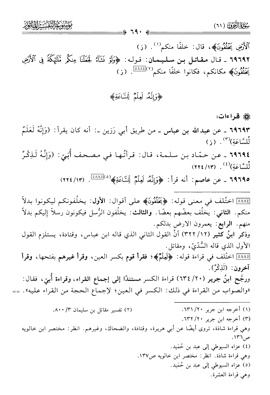 ٦٩٦٩٣ - عن عبد الله بن عباس -من طريق أبي رَزين- أنه كان يقرأ: (وإنَّهُ لَعَلَمٌ لِّلسّاعَةِ) (¬٣). (ز)